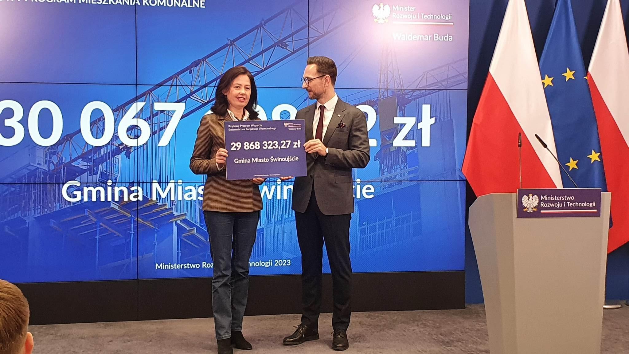 Ponad 29,8 mln złotych Gmina Miasto Świnoujście otrzymała z Rządowego Programu Mieszkania Komunalne na budowę 64 nowych mieszkań przy ulicy Ludzi Morza oraz remont klatki B już istniejącego budynku przy ulicy Modrzejewskiej 20. Czek na pieniądze odebrała w Ministerstwie Rozwoju i Technologii I Zastępca Prezydenta Świnoujścia Barbara Michalska.