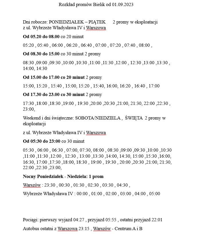Od 1 września od godz. 8 zmodyfikowany zostanie rozkład kursów promów Bielik na przeprawie Warszów. W dni powszednie (poniedziałek - piątek) w godzinach szczytu - od 5.20 do 8.00 oraz od 15.00 do 17.00 dwa promy będą pływać co 20 minut zgodnie z dotychczasowym rozkładem, czyli o pełnej godzinie, dwadzieścia i czterdzieści minut po pełnej godzinie.