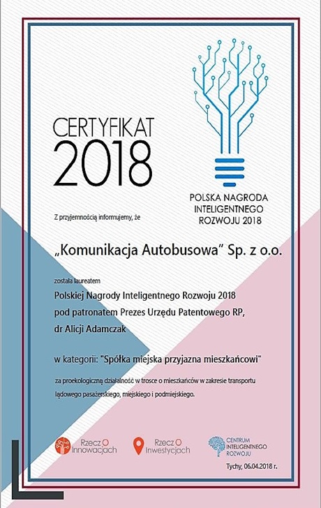 Za proekologiczną działalność w trosce o mieszkańców w zakresie transportu lądowego pasażerskiego, miejskiego i podmiejskiego dla świnoujskiej Komunikacji Autobusowej.