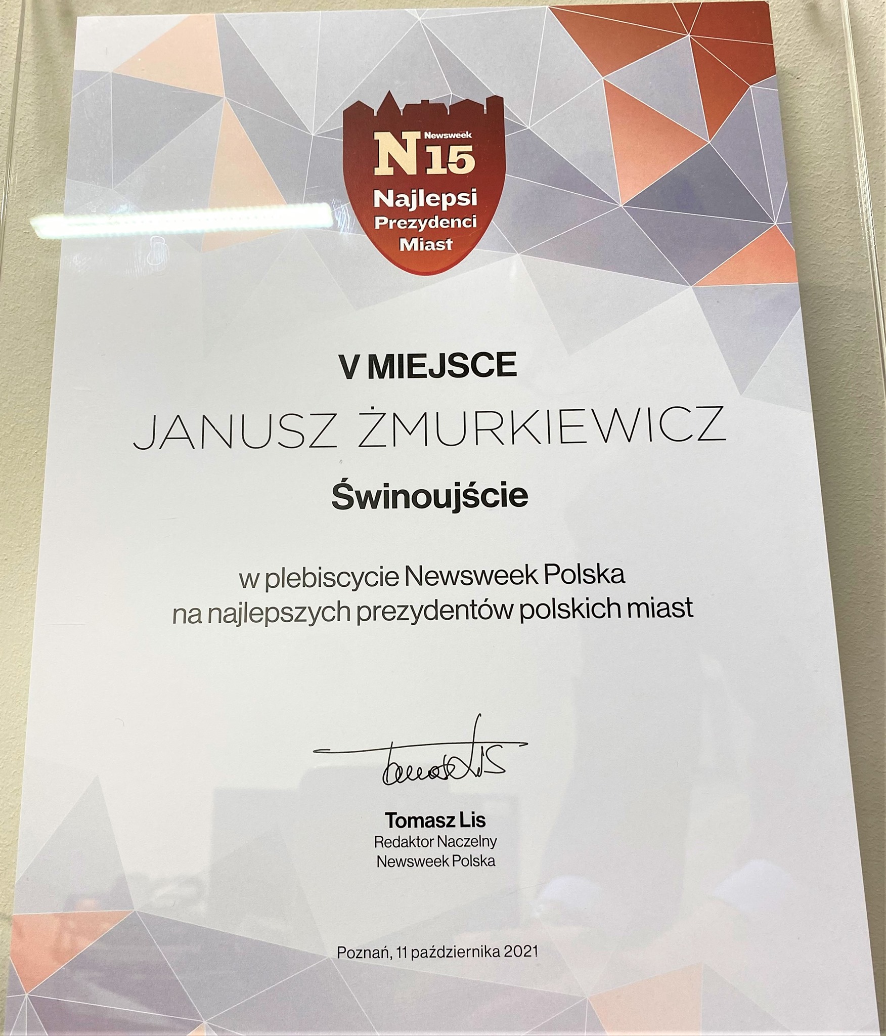 W plebiscycie Newsweek Polska na najlepszych prezydentów polskich miast Janusz Żmurkiewicz zajął wysokie miejsce. Poznań, 11 października 2021 r, N15 Najlepsi Prezydenci Miast, podpisano przez Redaktora Naczelnego Newsweek Polska Tomasza Lisa.