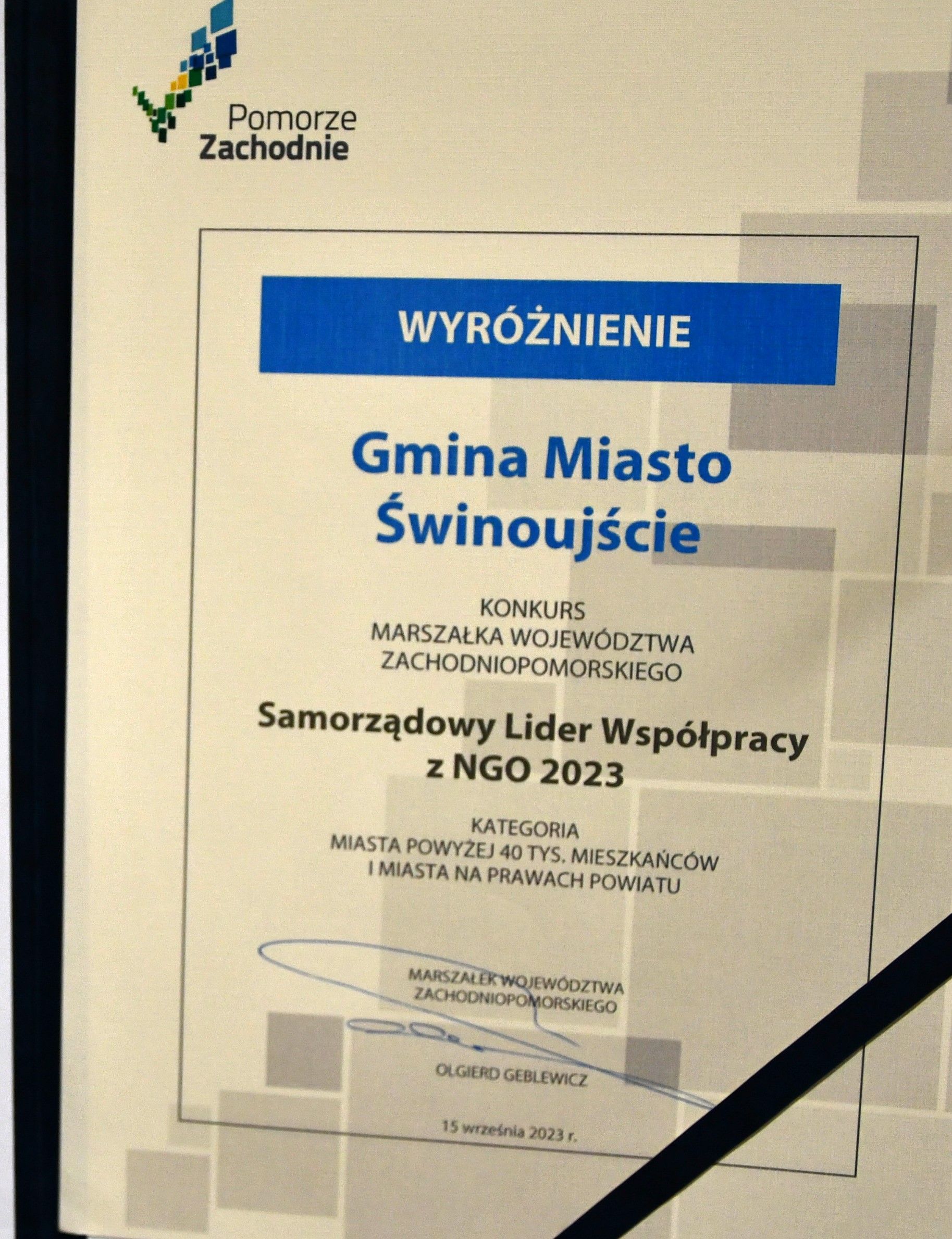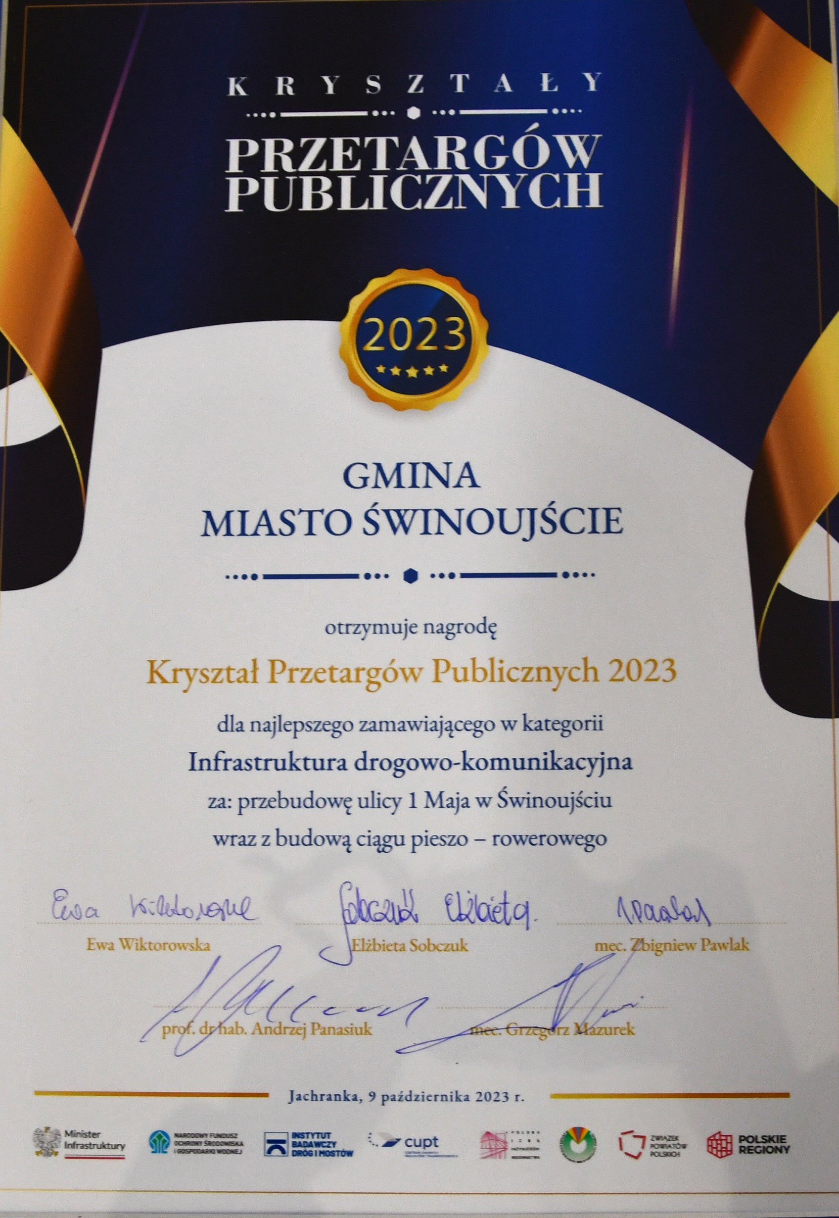 Gmina Miasto Świnoujście otrzymała nagrodę KRYSZTAŁ PRZETARGÓW PUBLICZNYCH 2023 za najlepszego zamawiającego (inwestora) w kategorii infrastruktura drogowo-komunikacyjna za przebudowę ulicy 1 Maja w Karsiborze wraz z budową ciągu pieszo – rowerowego.