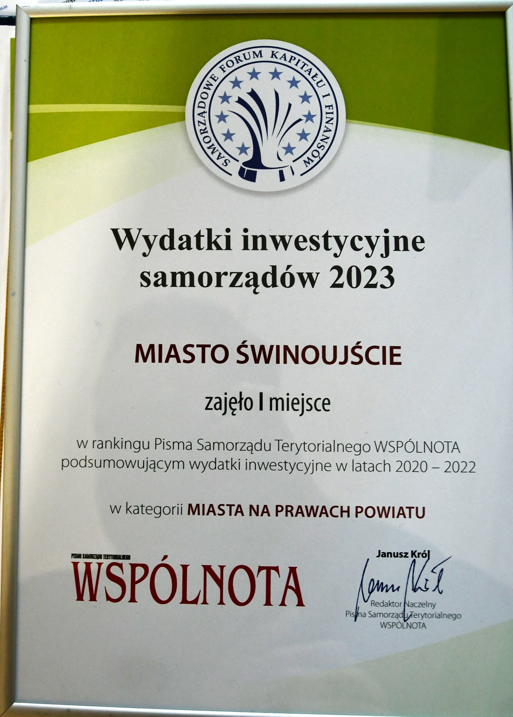 Już po raz piąty Świnoujście wygrało ranking polskich samorządów, które w ostatnich latach wydały najwięcej na inwestycje. Tym razem na inwestycje wydaliśmy 9.734,50 złotych w przeliczeniu na jednego mieszkańca. Drugie miejsc zajęło Krosno z kwotą 3.190, 51 zł. Na trzecim miejscu uplasowały się Gliwice z 2.992,58 złotych na jednego mieszkańca. Świnoujście jest jedynym miastem na prawach powiatu z województwa zachodniopomorskiego, które nie tylko zostało liderem, ale znalazło się pierwszej trzydziestce rankingu.