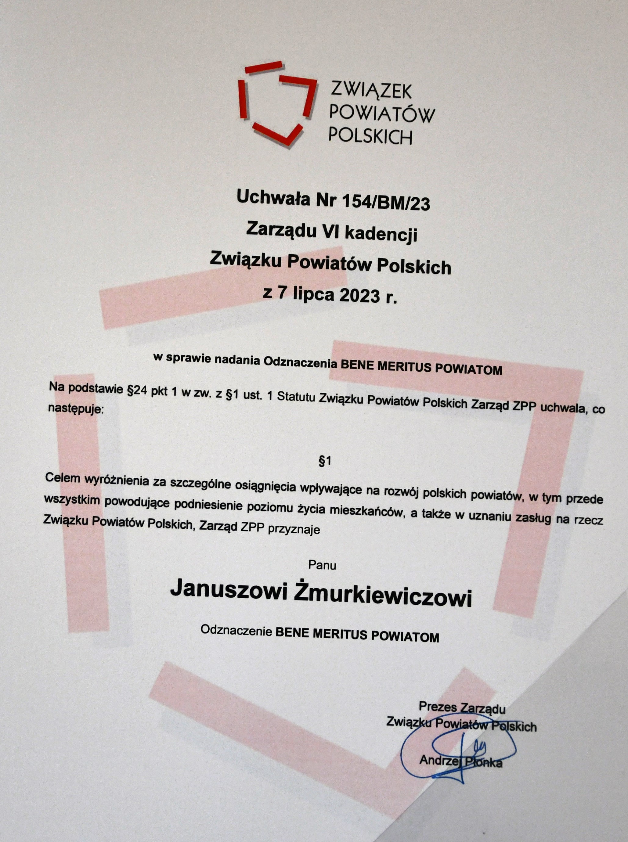 W 1998 roku, ustawa o samorządzie uregulowała funkcjonowanie powiatów w Polsce. 25 lat później, w rocznicę usamorządowienia wspólnot powiatowych, Zarząd Związku Powiatów Polskich przyznał Prezydentowi Januszowi Żmurkiewiczowi honorowy tytuł Prezydenta 25-lecia oraz odznaczenie Bene Meritus, za szczególne osiągnięcia wpływające na rozwój polskich powiatów, w tym przede wszystkim powodujące podniesienie życia mieszkańców. W imieniu zarządu, wyróżnienie wręczył starosta powiatu kamieńskiego Józef Malec.