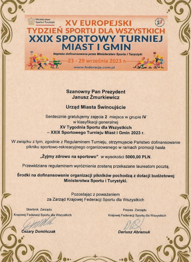 II miejsce w grupie IV w klasyfikacji generalnej XV Tygodnia Sportu dla Wszystkich - XXIX Sportowego Turnieju Miast i Gmin 2023.