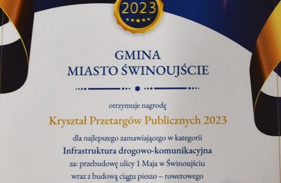 Gmina Miasto Świnoujście otrzymała nagrodę Kryształ Przetargów Publicznych 2023 za najlepszego zamawiającego (inwestora) w kategorii infrastruktura drogowo-komunikacyjna za przebudowę ulicy 1 Maja w Karsiborze wraz z budową ciągu pieszo – rowerowego.