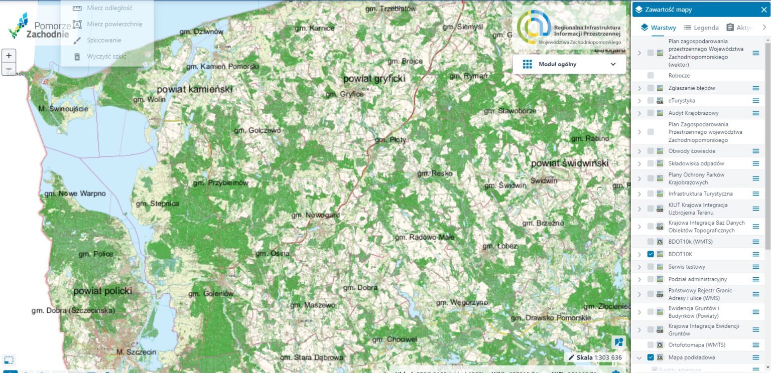 Geoportal Regionalnej Infrastruktury Informacji Przestrzennej Województwa Zachodniopomorskiego znajdziemy pod adresem: https://sip.wzp.pl/