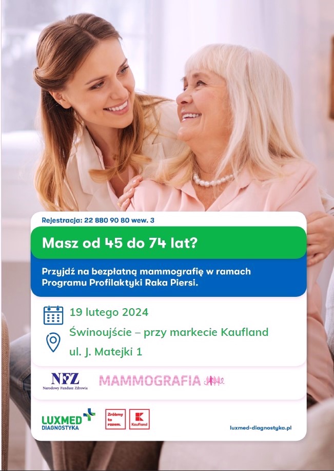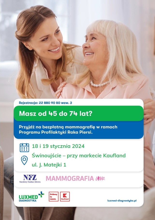 LUX MED zaprasza do mobilnej pracowni mammograficznej: w Świnoujściu w dniu 18 stycznia w godzinach od 8.40 do 17.00 i 19 stycznia w godzinach od 8.00 do 16.00 przy markecie Kaufland, ul. J. Matejki 1.