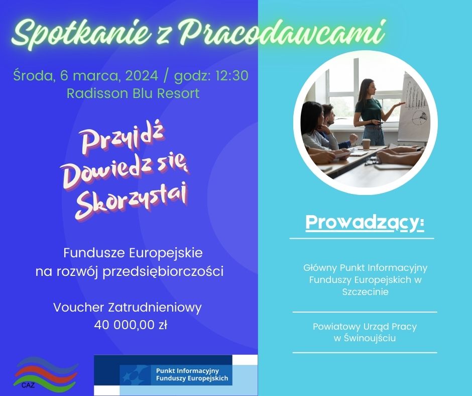 Spotkanie będzie miało na celu przybliżenie pracodawcom informacji nt. Funduszy Europejskich na rozwój przedsiębiorczości na Pomorzu Zachodnim oraz projektu "Voucher Zatrudnieniowy" w wysokości 40 000 zł, który jest instrumentem służącym Pracodawcy w odpowiednim przygotowaniu pracownika do wykonywania pracy na stanowisku pracy.
