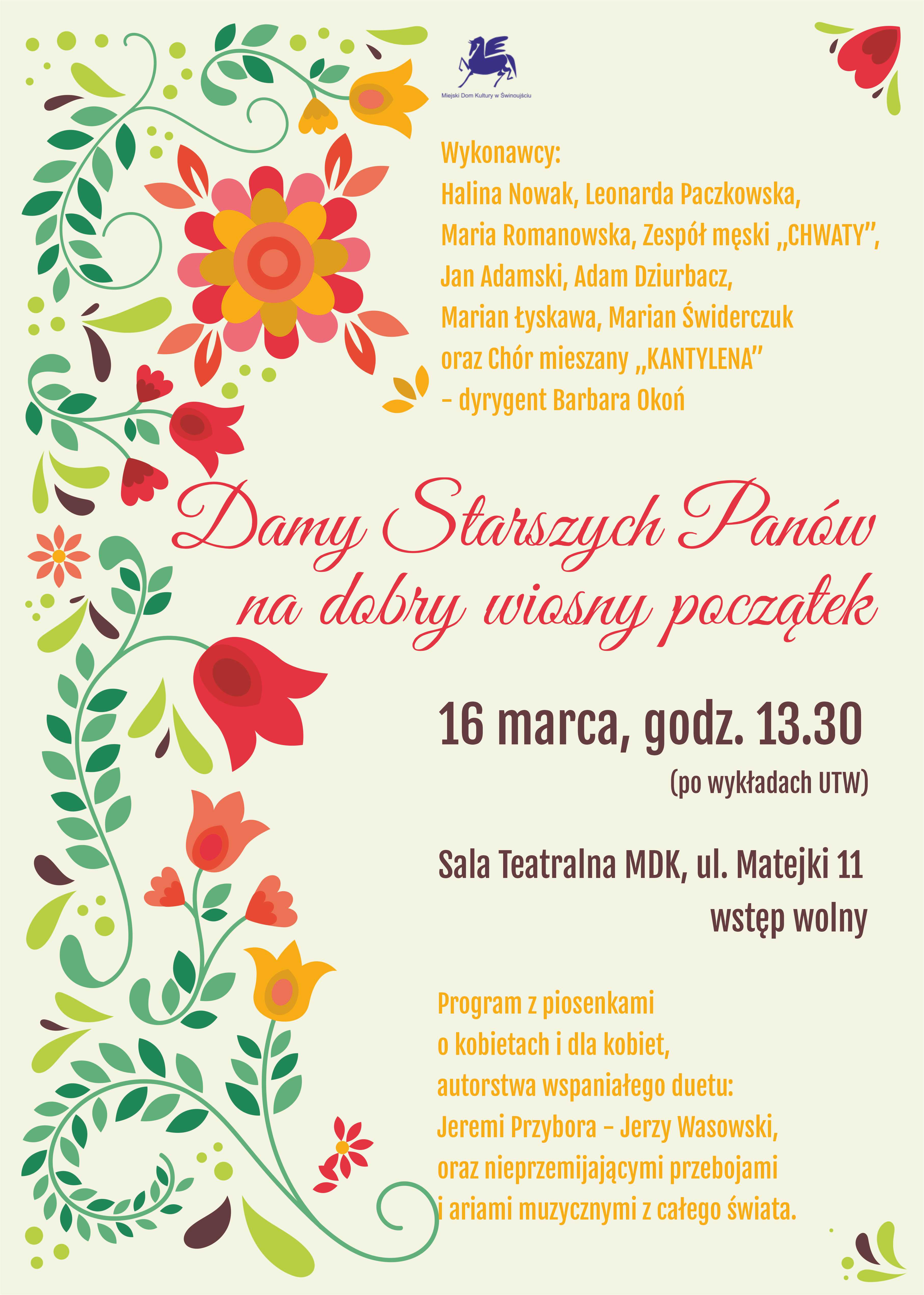 Miejski Dom Kultury, Uniwersytet Trzeciego Wieku w Świnoujściu serdecznie zapraszają na koncert "Damy Starszych Panów na dobry wiosny początek" w dniu 16 marca 2024 roku (sobota) o godz. 13.30 (po wykładach UTW) sala teatralna MDK ul. Matejki 11, wstęp wolny.