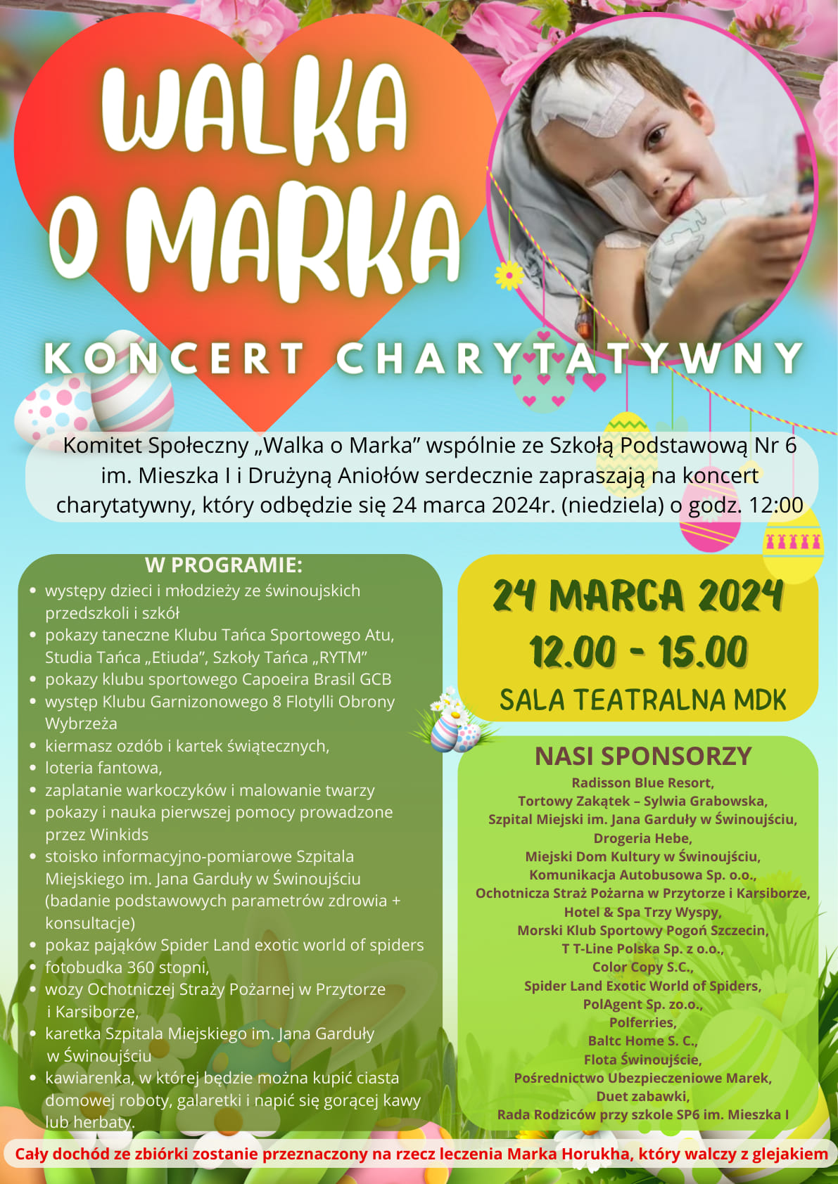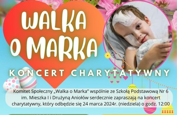 Komitet Społeczny „Walka o Marka” wspólnie ze Szkołą Podstawową Nr 6 im. Mieszka I i Drużyną Aniołów serdecznie zapraszają na koncert i kiermasz charytatywny, który odbędzie się 24 marca 2024 r. (niedziela) o godz. 12:00 w sali teatralnej i sali sportowej Miejskiego Domu Kultury w Świnoujściu.
