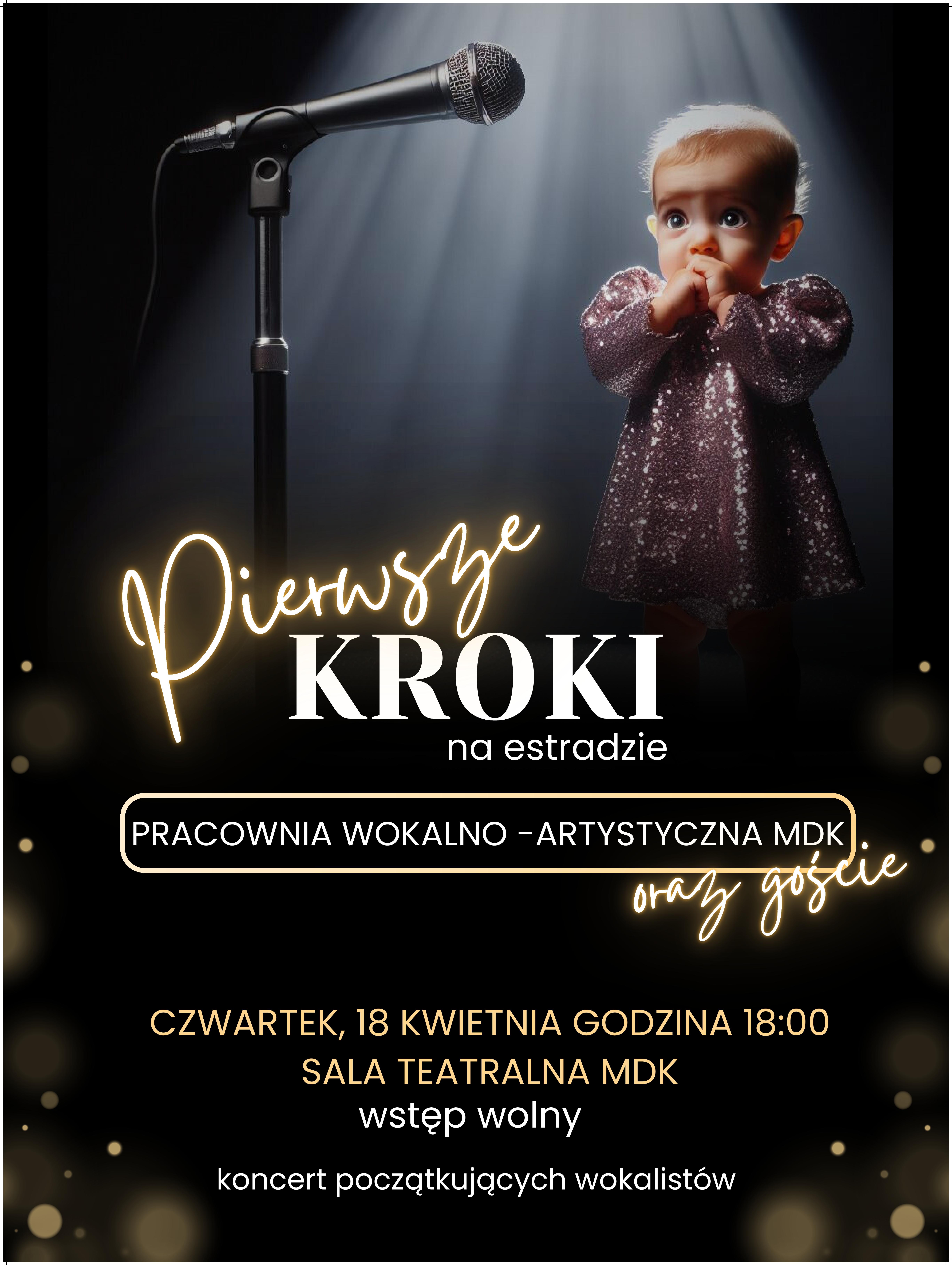 Z wielką radością zapraszamy na niezwykłe wydarzenie muzyczne – koncert Pracowni wokalno-artystycznej "Pierwsze Kroki na Estradzie"! To wyjątkowa okazja, aby byli Państwo świadkami debiutu początkujących wokalistów, którzy z odwagą stawiają pierwsze kroki w kierunku spełniania swoich marzeń.