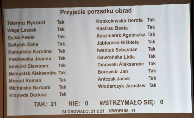 Po przyjęciu porządku obrad rozpoczął się wybór przewodniczącego RM. Zgłoszono tylko jednego kandydata – Ryszarda Teterycza, który w tajnym głosowaniu otrzymał 19 głosów „za”.