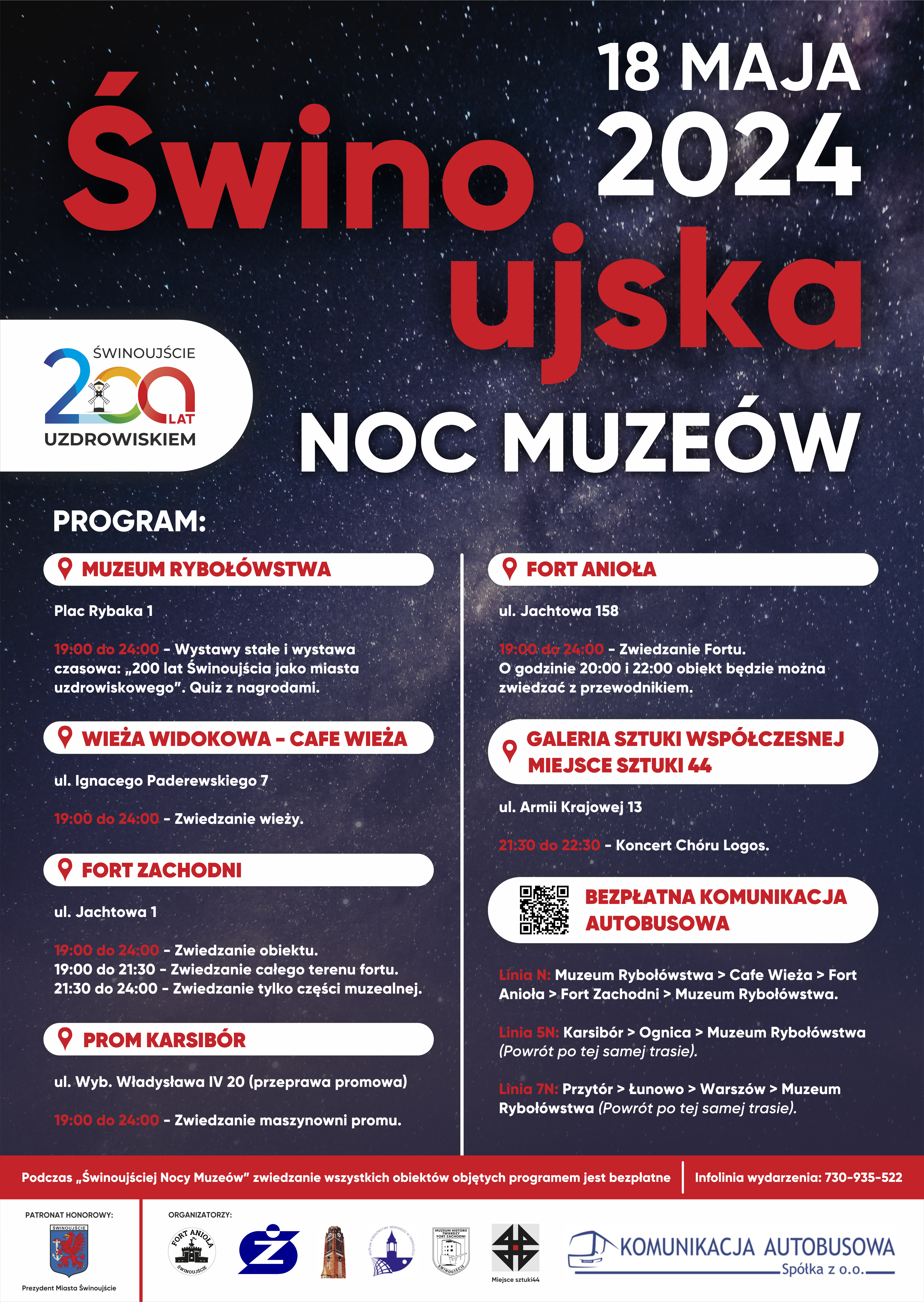 Odkryj wcześniej niedostępny pokład promu Karsibór, wejdź na szczyt wieży dawnego luterańskiego kościoła, zajrzyj w zakamarki Muzeum Rybołówstwa Morskiego, a jeśli się nie boisz, to przemierz ciemne korytarze Fortu Zachodniego i Fortu Anioła. Muzyczną niespodziankę przygotuje Miejsce Sztuki 44 oraz Chór Logos. Specjalne autobusy za darmo zawiozą do atrakcji turystycznych. To będzie noc pełna historii i tajemnic, której nie można przegapić.