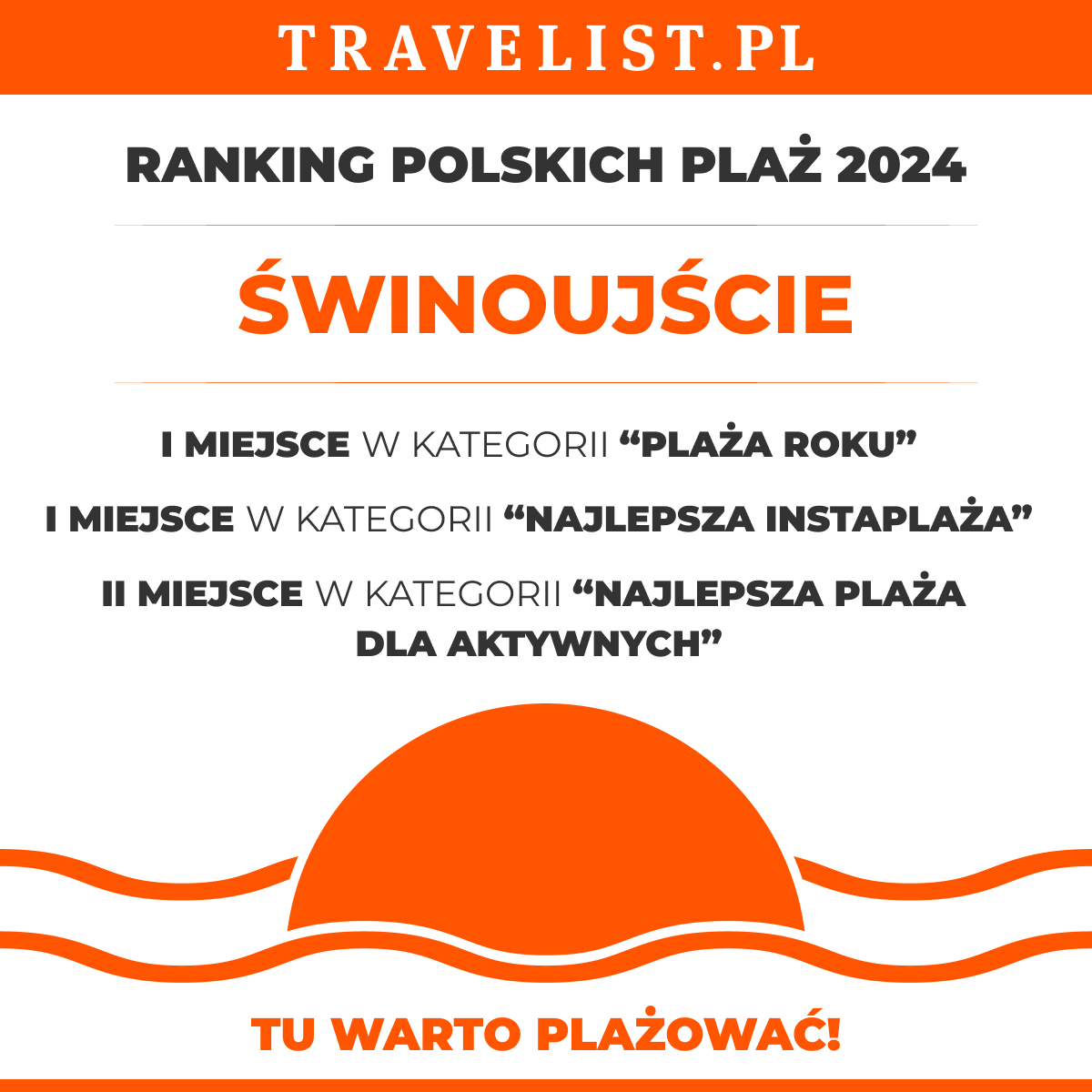 Która plaża została królową polskiego wybrzeża? Oczywiście, nasza - świnoujska! W rankingu Travelist.pl plaża na wyspie Uznam zdobyła I miejsce w kategorii Plaża Roku oraz Najlepsza Instaplaża a także II miejsce w kategorii Najlepsza plaża dla aktywnych.