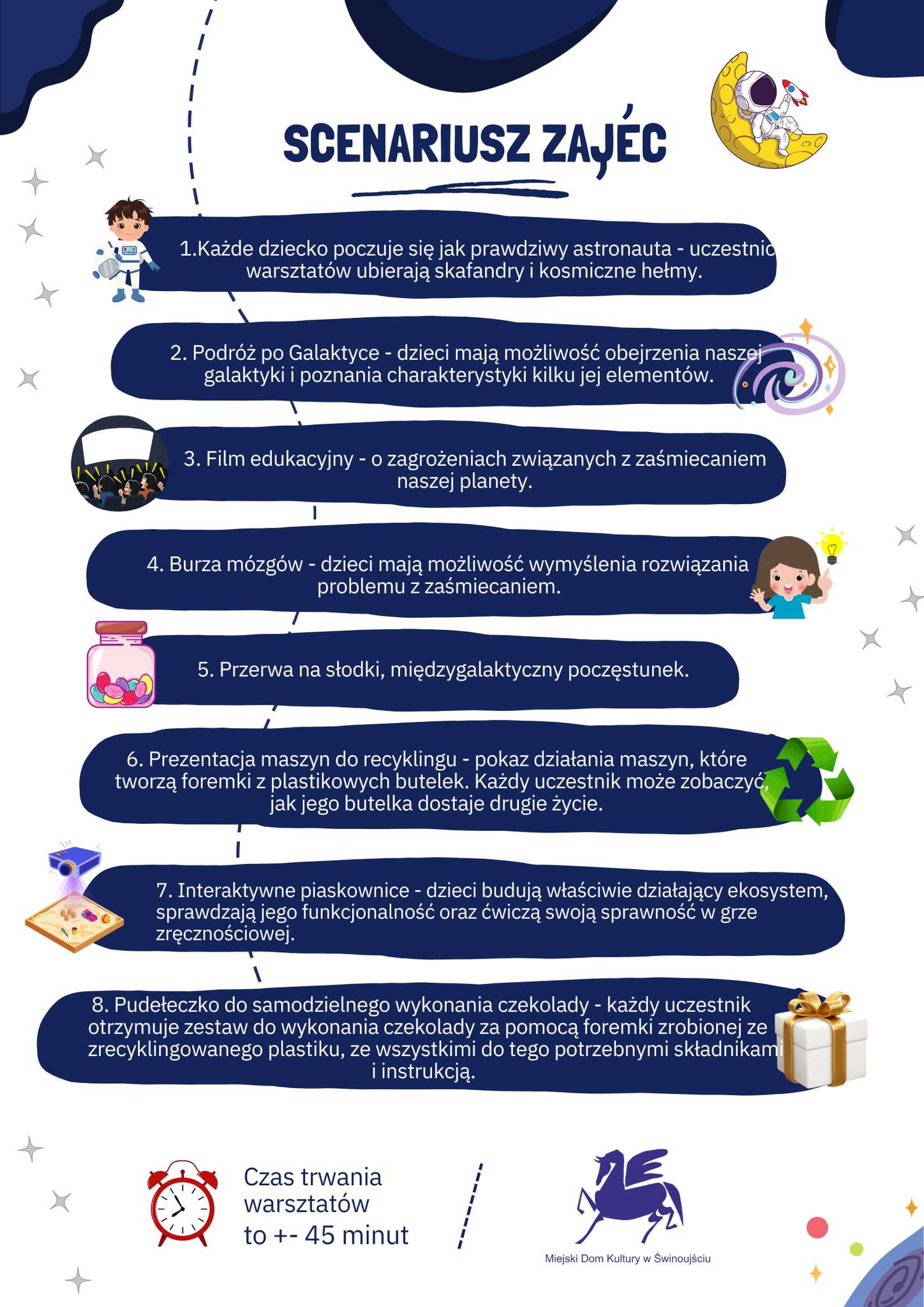 Zaprezentowany zostanie film edukacyjny o zagrożeniach związanych z zaśmieceniem planety oraz odbędzie się burza mózgów dotycząca rozwiązania tego problemu. Uczestnikom zostanie udostępniona prezentacja maszyn do recyklingu, a także każdy będzie mógł obejrzeć jak jego butelka dostaje drugie życie. Organizatorzy przewidują inne atrakcje oraz przerwę na słodki, międzygalaktyczny poczęstunek.