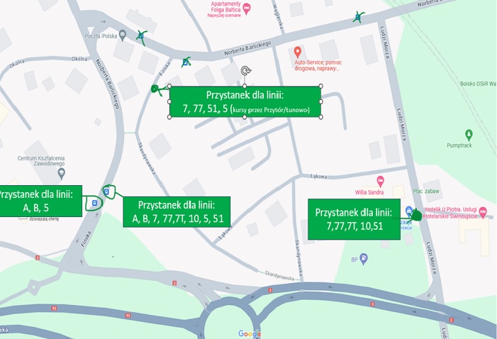 linii: 7, 77, 51 jadące z Węzła Przesiadkowego w kierunku Dzielnicy Warszów mają wyznaczony przystanek zastępczy przy ul. Fińskiej na tymczasowym łączniku z ul. Barlickiego,