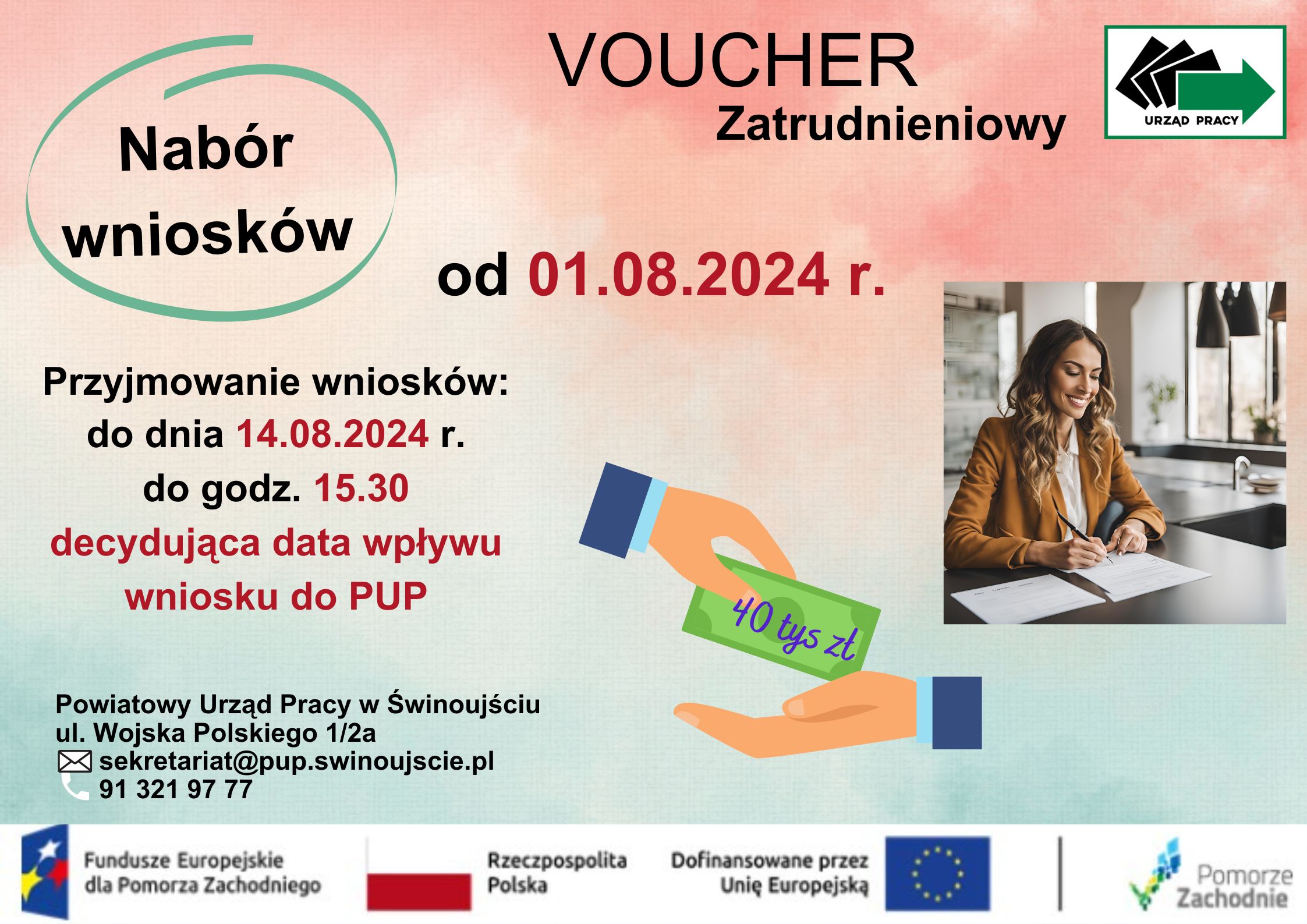 Gmina Miasto Świnoujście/Powiatowy Urząd Pracy w Świnoujściu realizuje projekt konkurencyjny pn .„Voucher zatrudnieniowy" współfinansowany ze środków Unii Europejskiej w ramach Programu Fundusze Europejskie dla Pomorza Zachodniego 2021-2027.