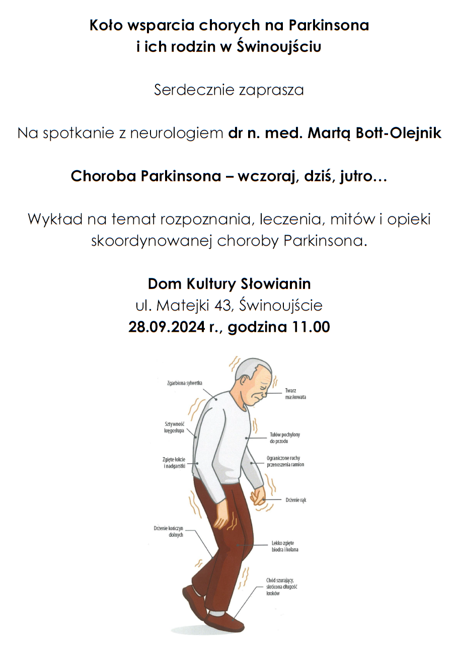 Koło wsparcia chorych na Parkinsona i ich rodzin w Świnoujściu zaprasza na spotkanie z dr n. med. Martą Bott-Olejnik. Będzie to wykład na temat rozpoznania, leczenia, mitów i opieki skoordynowanej choroby Parkinsona.