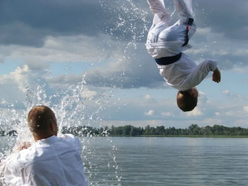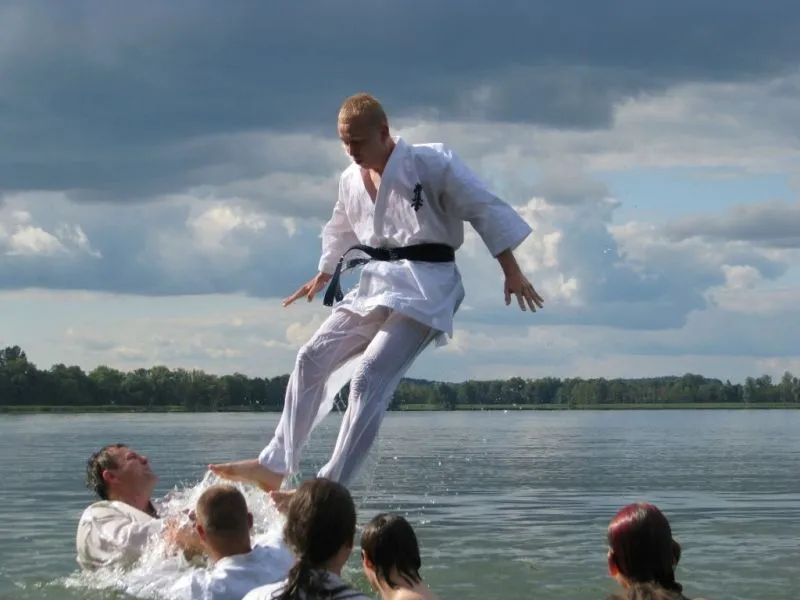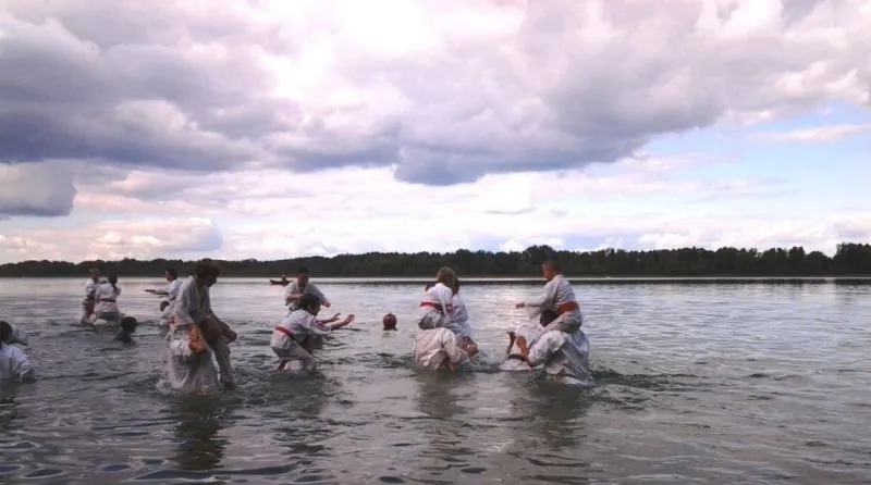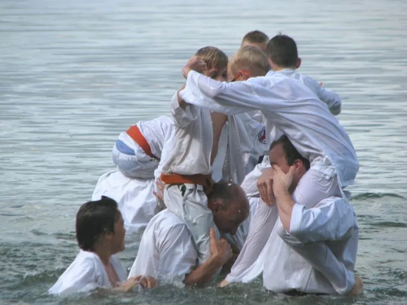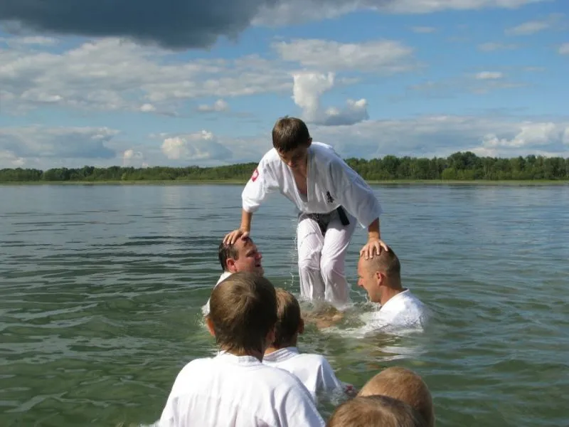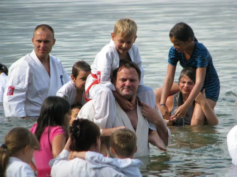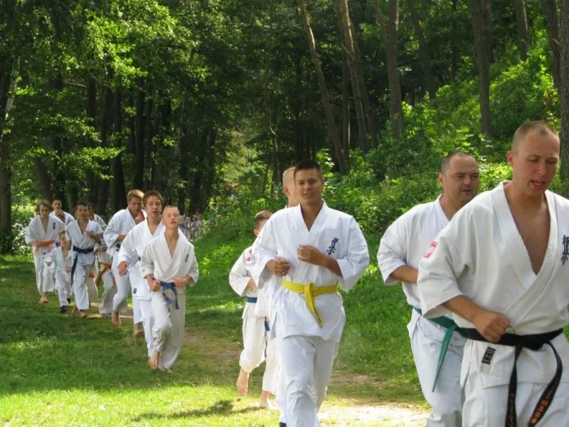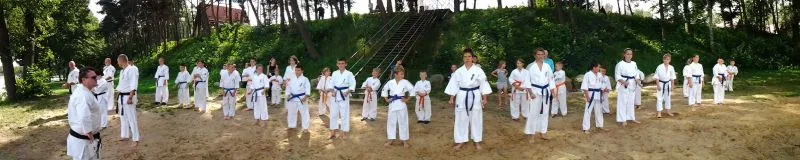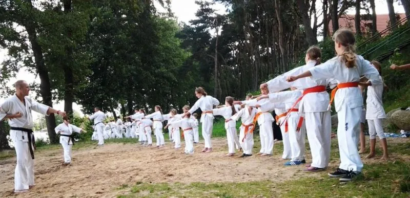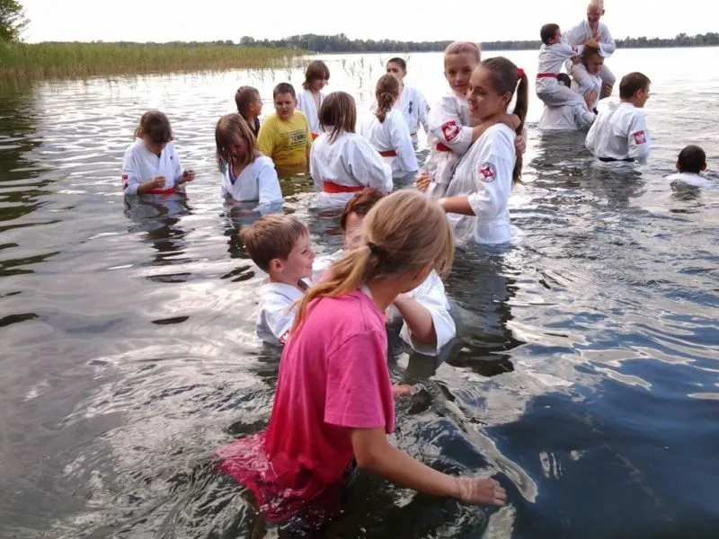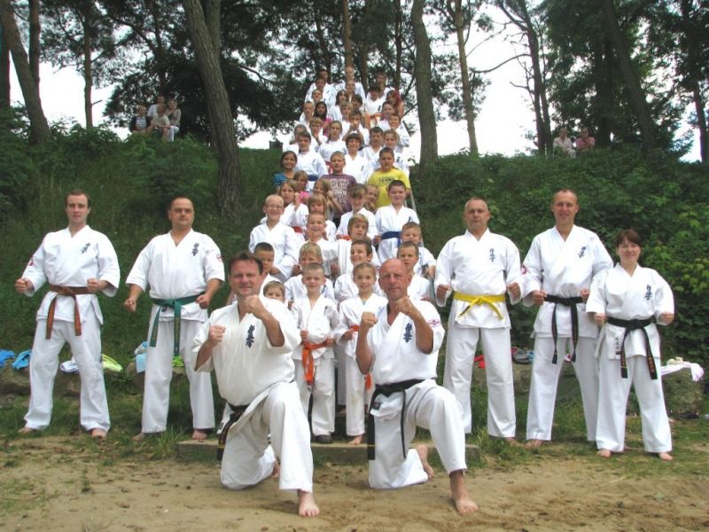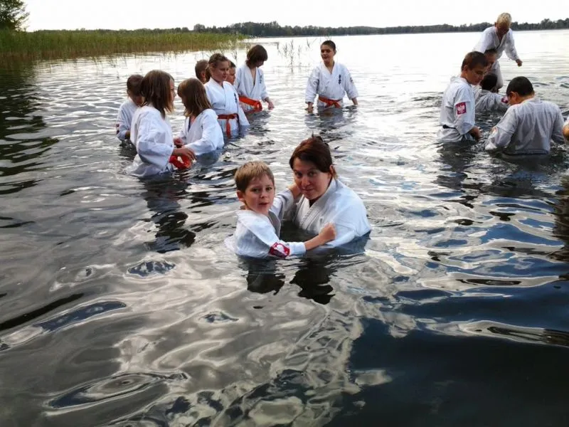 61 młodych adeptów karate w tym sześcioro dzieci ze świetlicy środowiskowej Caritas brało udział w obozie sportowym w miejscowości Pszczew nad jeziorem Szarcz Duży (I Klasa czystości wody !!!) zorganizowanym przez Świnoujską Akademię Karate Kyokushin. Oprócz codziennych treningów w terenie, zawodnicy korzystali z możliwości nauki jazdy konnej oraz zwiedzali jezioro pokonując wiele kilometrów na kajakach. W ramach relaksu zwiedzili Międzyrzecki Rejon Umocniony oraz Palmiarnie w Poznaniu gdzie mieli możliwość podziwiania wielu egzotycznych okazów flory i fauny, wiele radości wywołały u dzieci przepiękne i wielokolorowe okazy karpi, które same podpływały do zwiedzających by je pogłaskać:):):). Średnio w ciągu dnia odbywały się 4 treningi, z czego pierwszy i czwarty był poświęcony ćwiczeniom rozciągającym i wzmacniającym, drugi podobnie jak trzeci poświęcony był na kihon, kata, kumite oraz ćwiczenia siłowe oraz  wytrzymałościowe. Czwarty ostatni trening wieczorny podobnie jak pierwszy opierał się na ćwiczeniach rozciągających i wzmacniających. Podczas obozu dużym zainteresowaniem cieszyły się podchody nocne, które kończyły się około godz. 1:00 nad ranem. Zapraszamy na treningi!!! Więcej na www.akademiakarate.com
