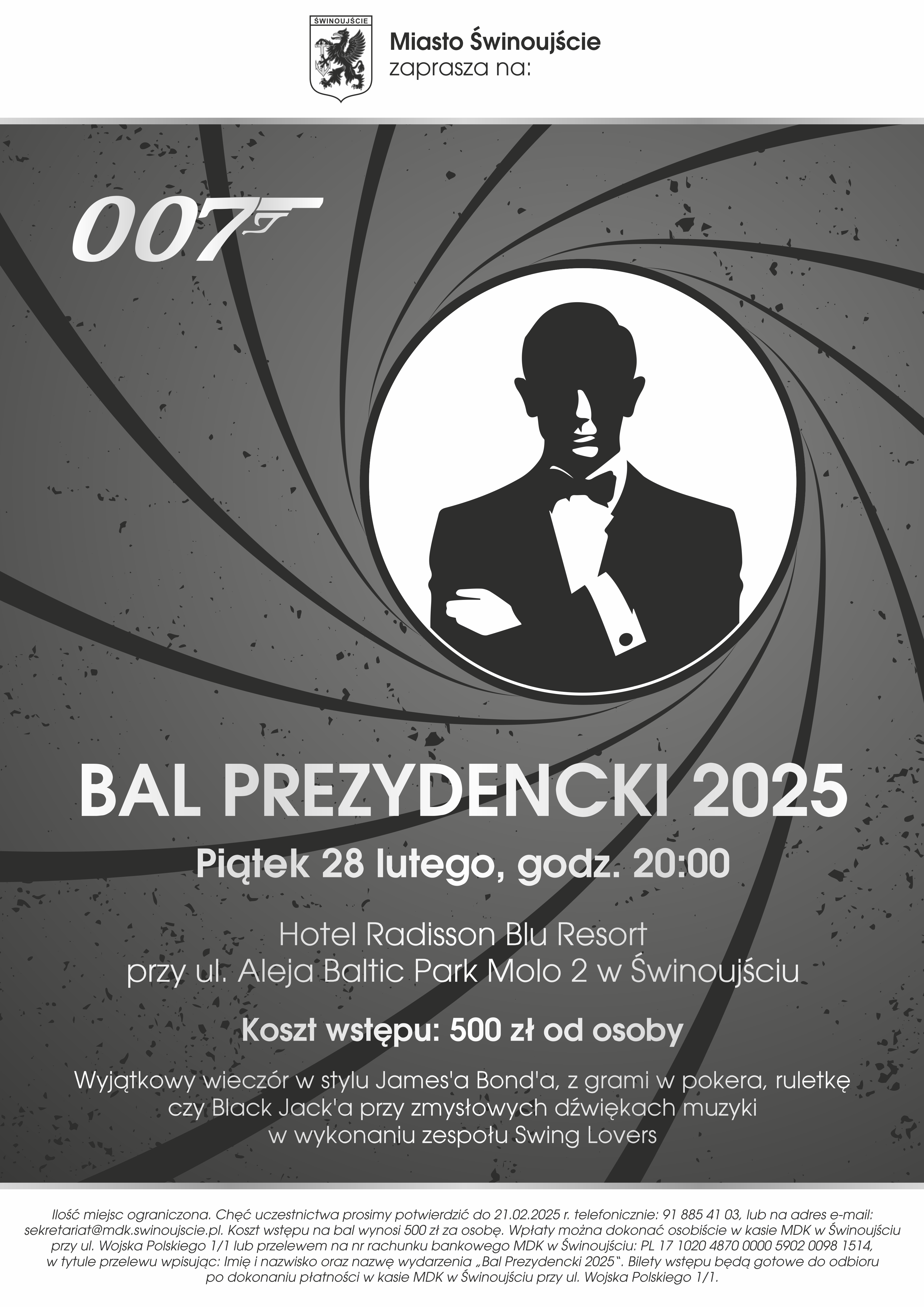 Koszt wstępu na bal wynosi 500 zł za osobę. Wpłaty można dokonać osobiście w kasie MDK w Świnoujściu przy ul. Wojska Polskiego 1/1 lub przelewem na nr rachunku bankowego MDK w Świnoujściu: PKO BP 17 1020 4870 0000 5902 0098 1514, w tytule przelewu wpisując: Imię i nazwisko oraz nazwę wydarzenia „Bal Prezydencki 2025“.
