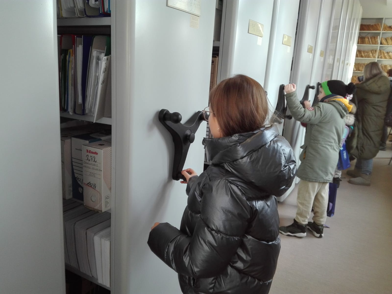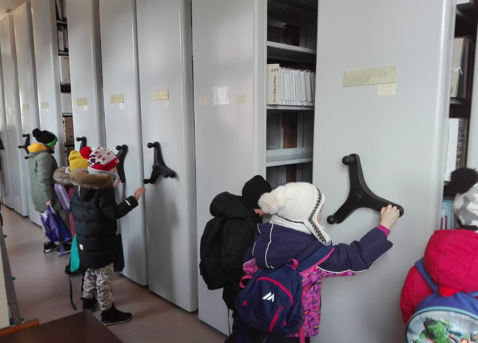Ostatnim punktem wizyty było zwiedzanie miejskiego archiwum, gdzie dzieci miały okazję obejrzeć potężne regały wypełnione archiwalnymi dokumentami. Choć każdy z tych regałów waży około 2 ton, dzięki specjalnym korbom, można je łatwo przesuwać na boki. Dzieci były zafascynowane tym, jak przechowywane są ważne akta, które stanowią część historii miasta.