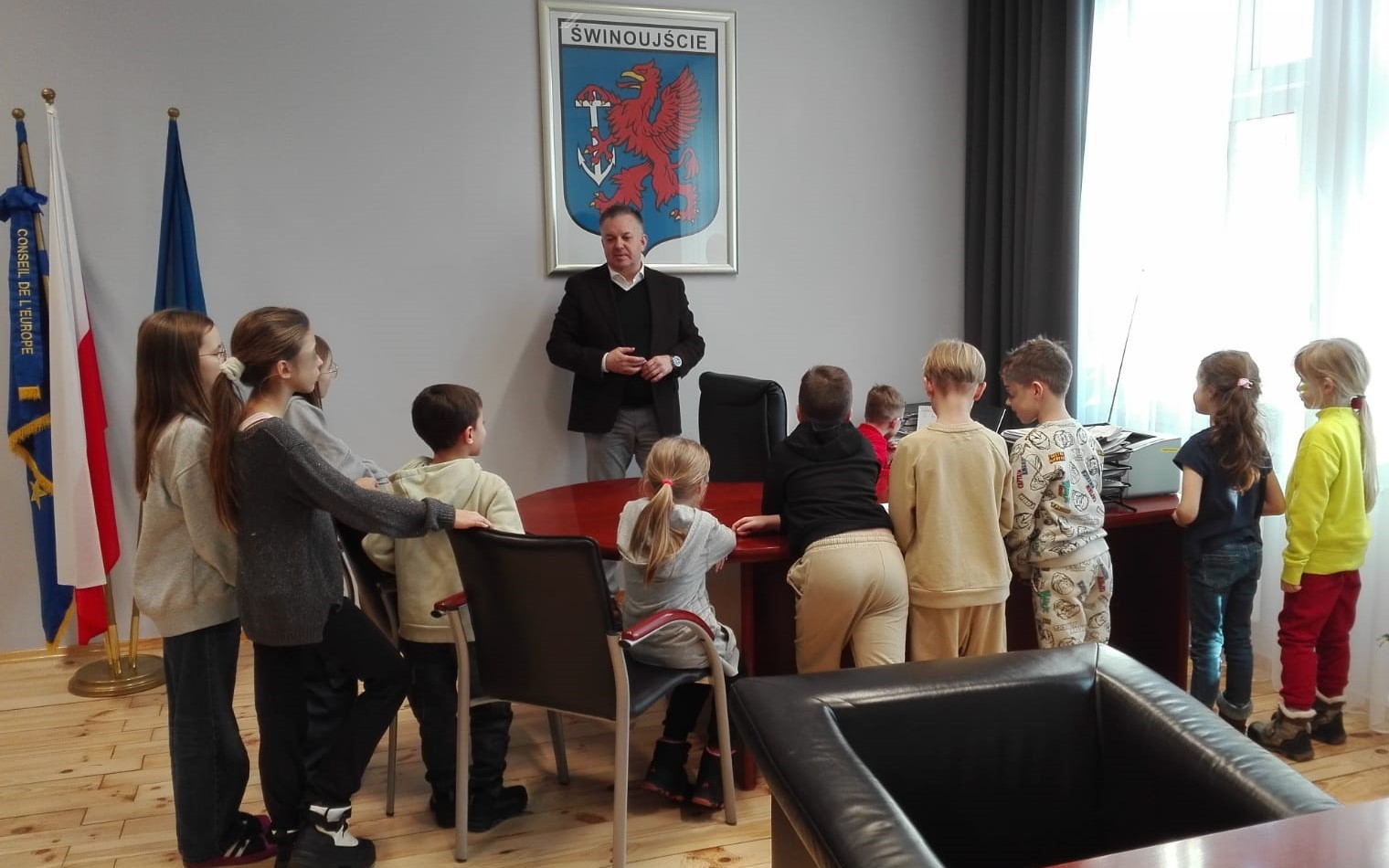 Z powodu nieobecności Prezydent Miasta Joanny Agatowskiej, dzieci zostały serdecznie przyjęte przez Zastępcę Prezydenta Romana Kucierskiego, który opowiedział im o specyfice pracy w samorządzie. Dzieci miały okazję zasiąść w fotelu prezydenta miasta i poznać tajniki podejmowania ważnych decyzji, które wpływają na życie Świnoujścia i jego mieszkańców. Zastępca Prezydenta chętnie odpowiadał na liczne pytania, które dotyczyły pracy włodarzy miasta, a także podarował dzieciom torby z upominkami na pamiątkę spotkania.