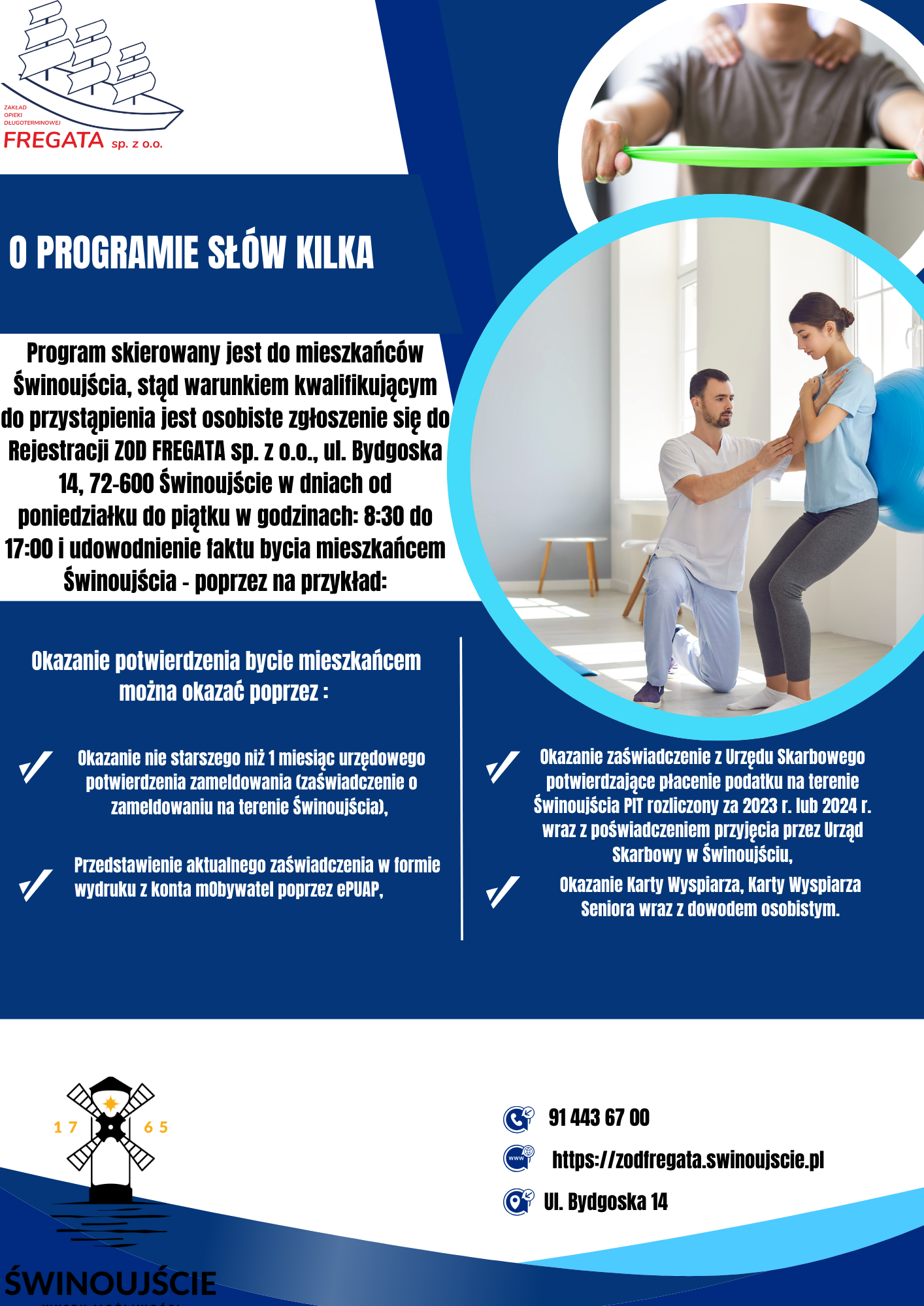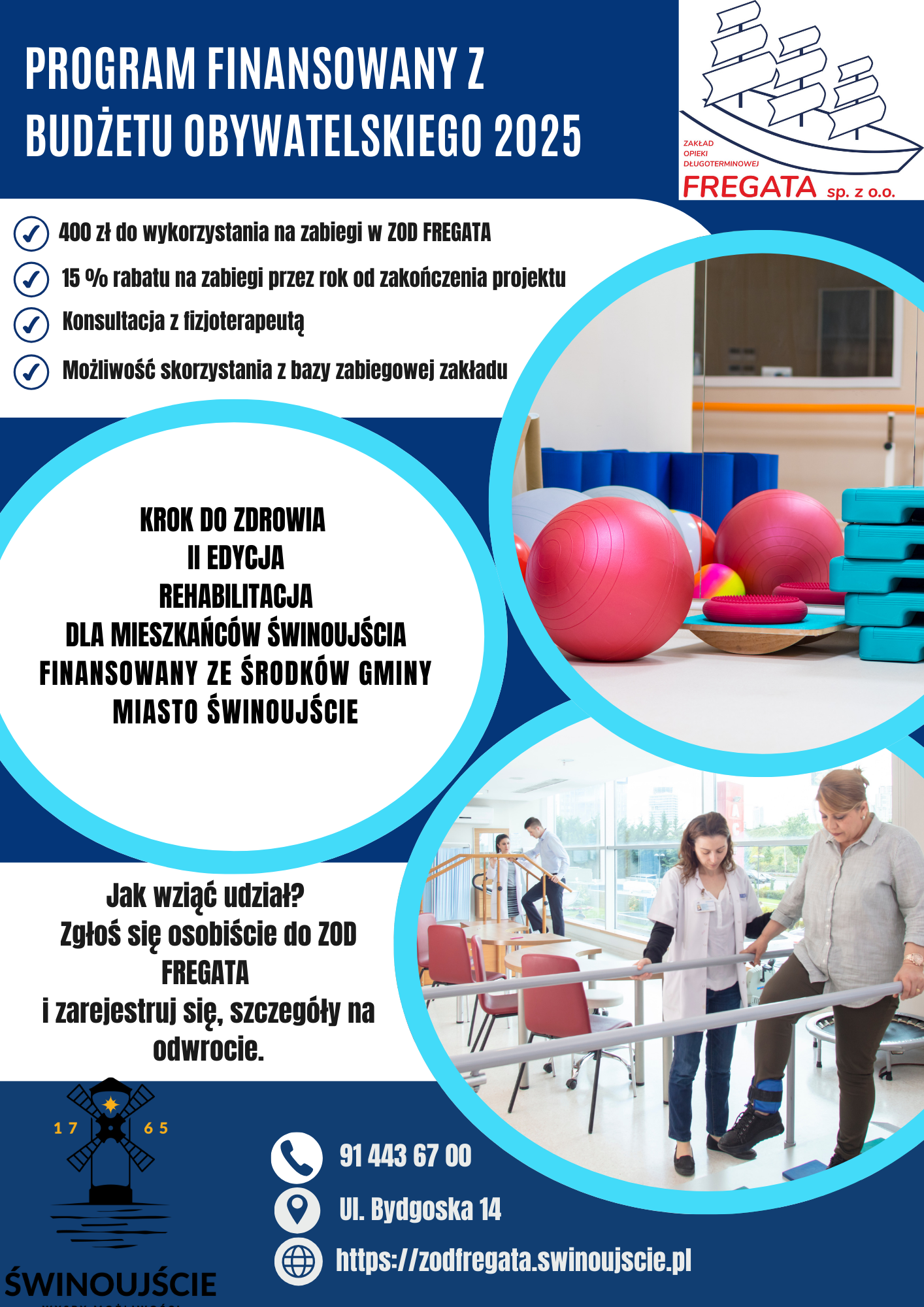 Już od 7 kwietnia br. ruszają zapisy na program finansowany z budżetu obywatelskiego: KROK DO ZDROWIA – EDYCJA II – REHABILITACJA DLA MIESZKAŃCÓW ŚWINOUJŚCIA. Projekt ma na celu umożliwienie aż 137 mieszkańcom Świnoujścia skorzystania z zabiegów rehabilitacyjnych na łączną kwotę 400,00 zł - na bazie zabiegowej ZOD FREGATA mieszczącej się przy ul. Bydgoskiej 14 w Świnoujściu.