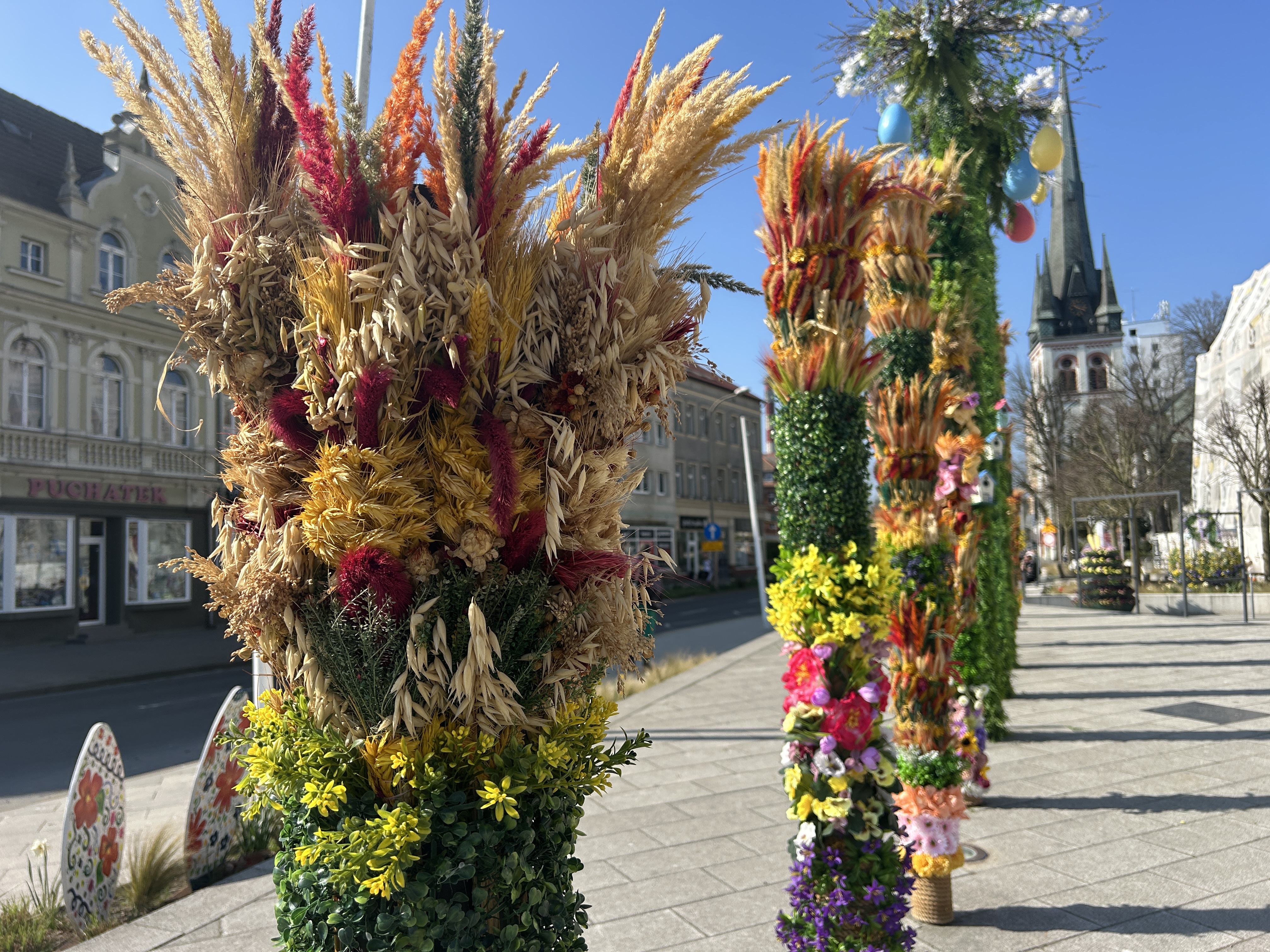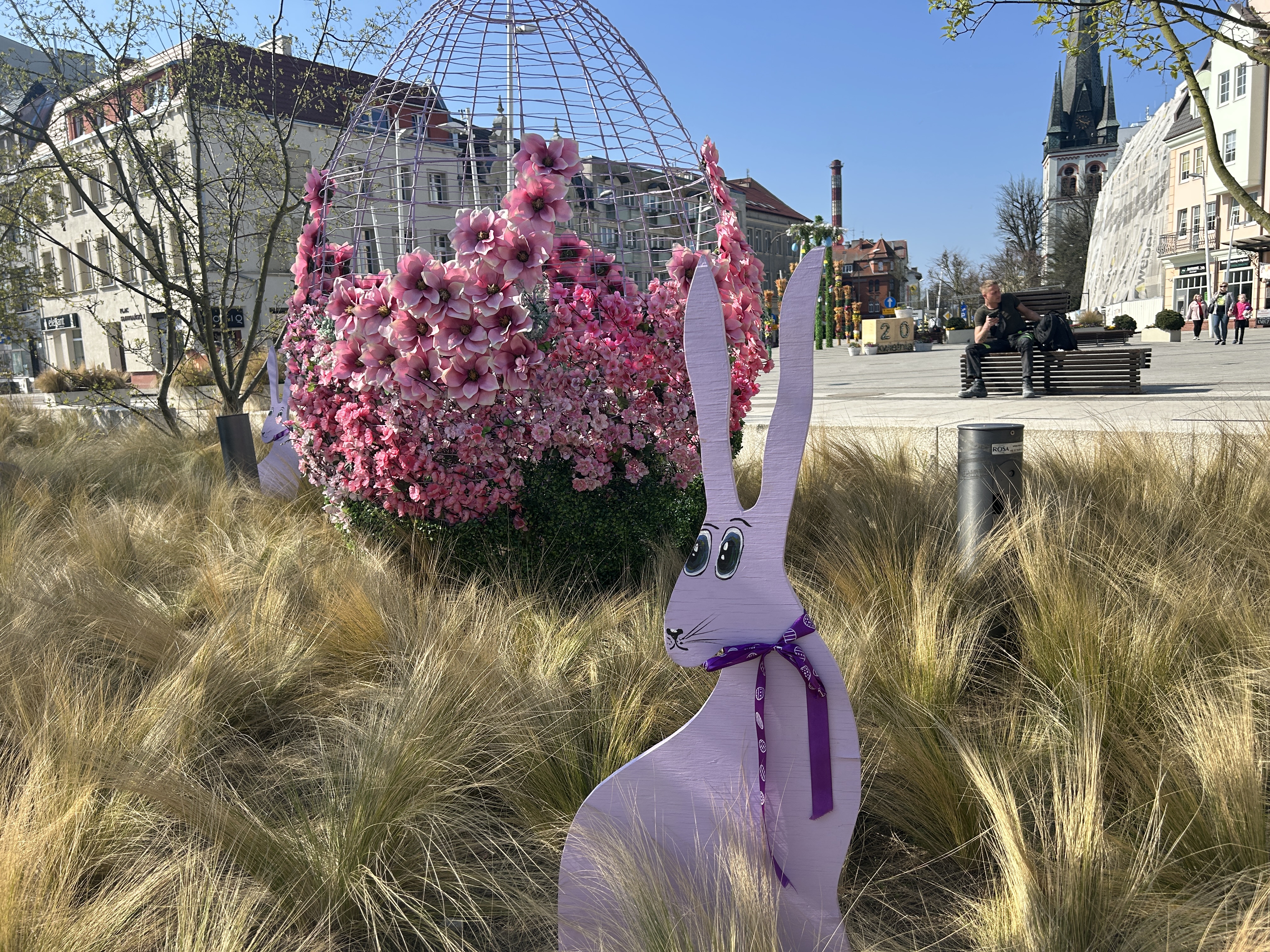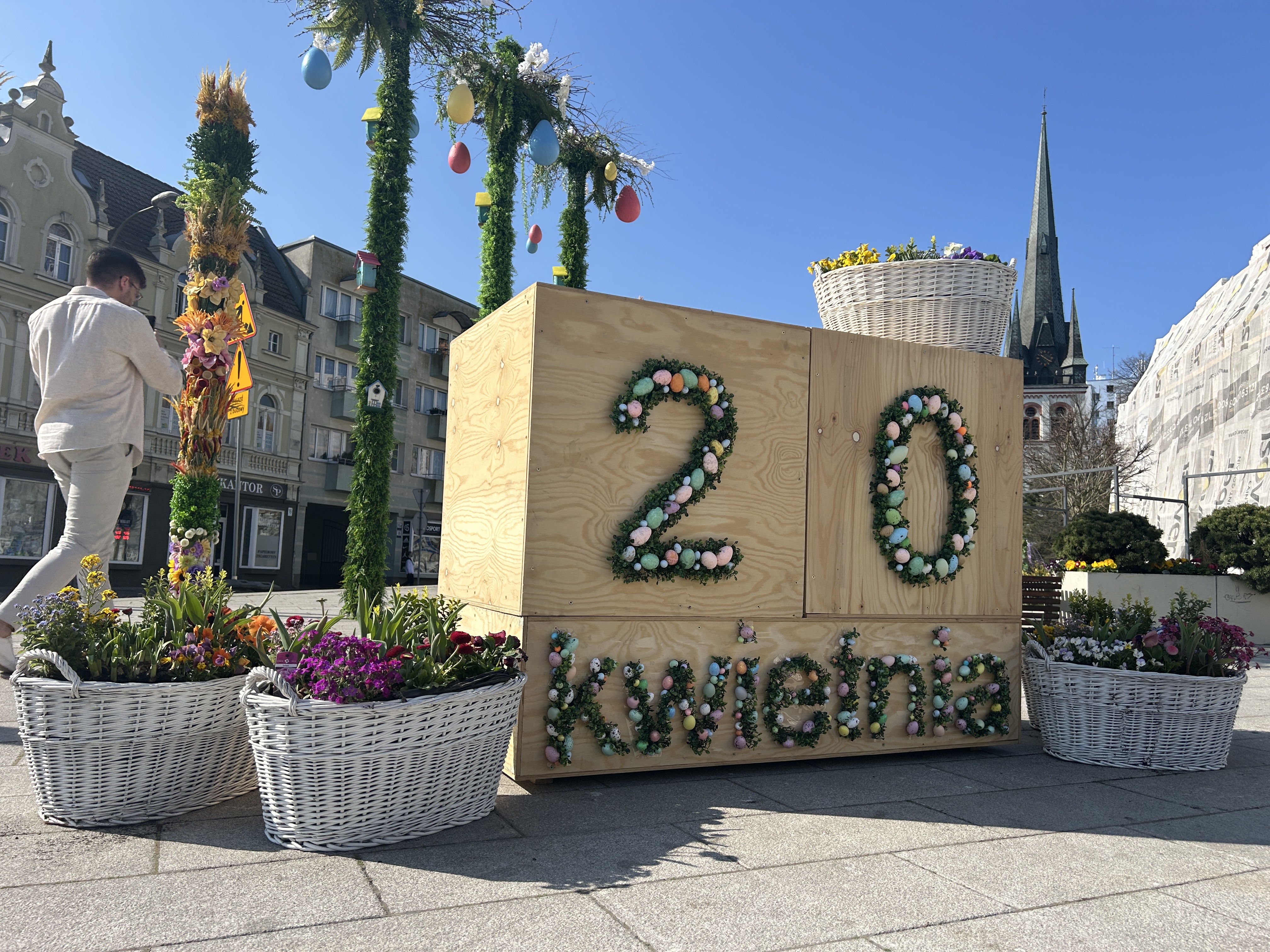Plac Wolności jak co roku jest świąteczną wizytówką miasta. Oprócz kwiatów i palm można tam zobaczyć drewniane zające, kolorowe jajka, ratanowe kule i wiklinowe kosze z kwiatami. W tym roku pojawiła się też nowa atrakcja – drewniany „datownik”, czyli tablica z datą Wielkanocy, przy której można zrobić sobie pamiątkowe zdjęcie. Tło stanowią piękne, wiosenne dekoracje, więc zdjęcia wychodzą wyjątkowe.