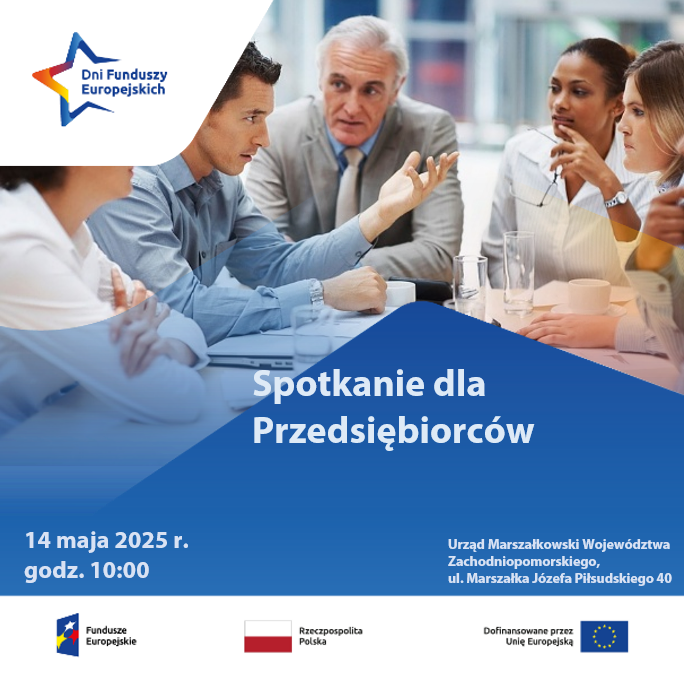 Główny Punkt Informacyjny Funduszy Europejskich w Szczecinie wraz z Partnerami w dniu 14 maja 2025 roku organizuje stacjonarne spotkania informacyjne pt. „Fundusze Europejskie dla Przedsiębiorców”.