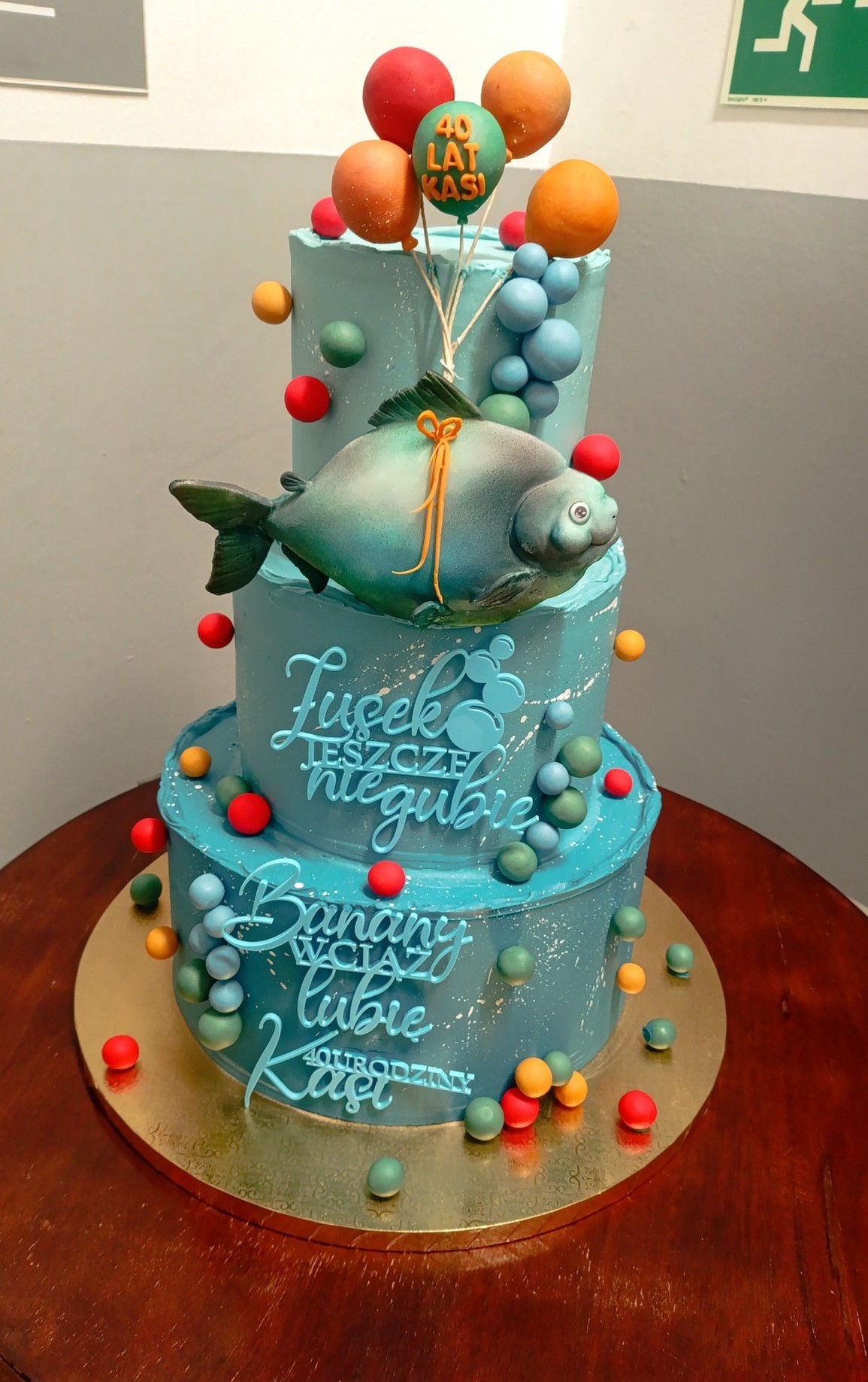 W dniu urodzin, wokół przeszklonego akwarium Kasi, zebrał się tłum dzieci, młodzieży i dorosłych, którzy przyszli złożyć jej życzenia. Organizatorzy nie zapomnieli o tradycyjnym elemencie urodzin – torcie dla jubilatki. Był on w kolorze niebieskim, z dużą figurką ryby, z humorystycznym napisem poniżej: "Łusek jeszcze nie gubię, banany wciąż lubię". Na torcie znajdowała się także świeczka – fajerwerk, który wystrzelił w górę.