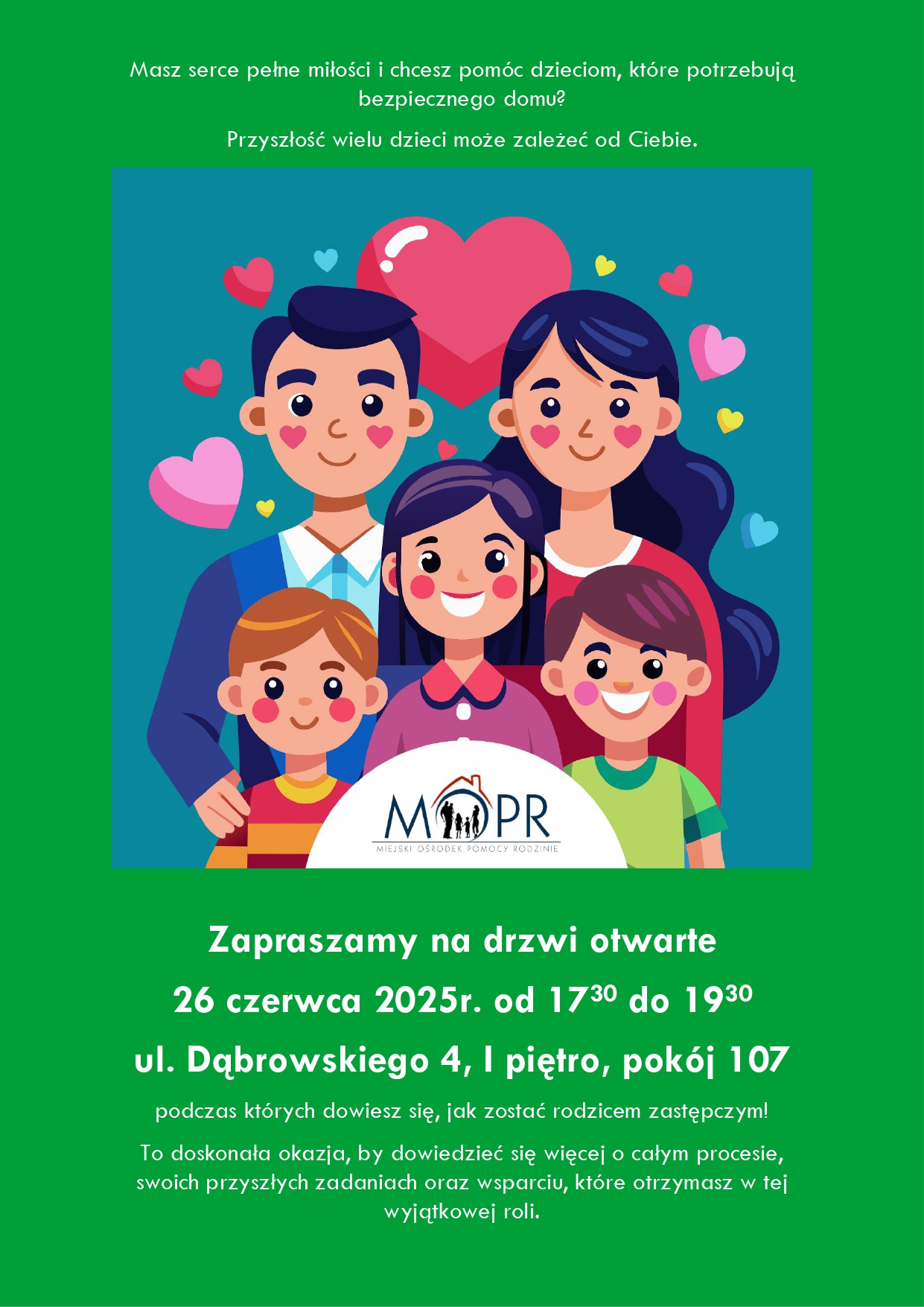 Przyszłość wielu dzieci, które nie mogą liczyć na opiekę swoich biologicznych rodziców, może zależeć od Ciebie – masz szansę zostać rodzicem zastępczym. Miejski Ośrodek Pomocy Rodzinie (MOPR) organizuje Dni Otwarte, które będą doskonałą okazją, by dowiedzieć się, jak pełnić tę rolę i jak pomóc dzieciom, które znalazły się w trudnej sytuacji życiowej.