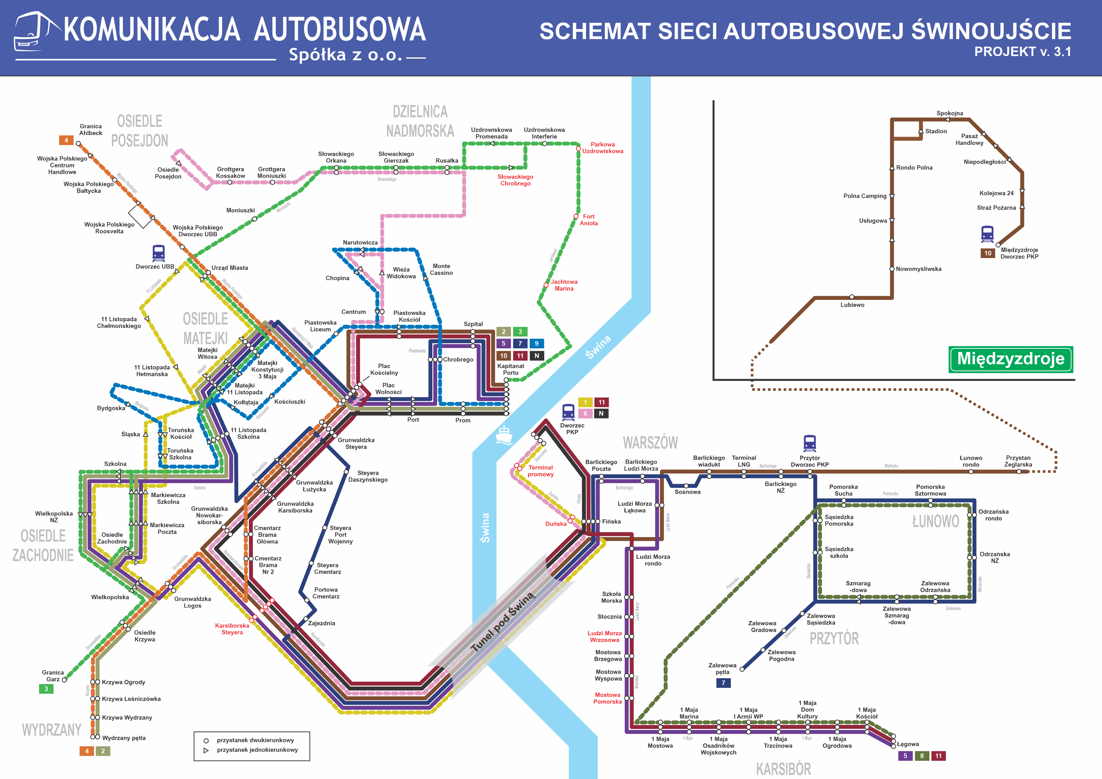 · Linia 3: Granica Garz – Os. Zachodnie – Os. Matejki – Dzielnica Nadmorska – Marina – Kapitanat Portu