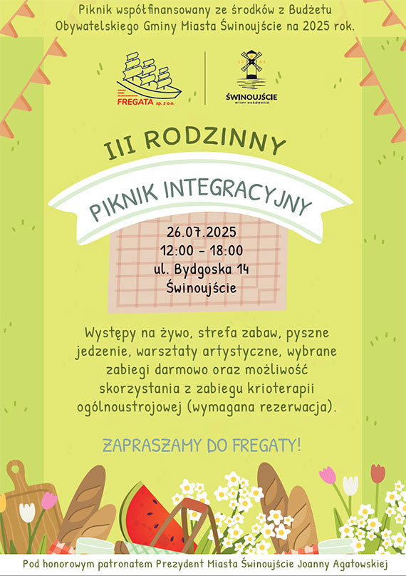 W imieniu ZOD FREGATA sp. z o.o. zapraszamy wszystkich chętnych na III Rodzinny Piknik Integracyjny – Integracja Pokoleń, który odbędzie się już 26 lipca na terenie ZOD Fregata w Świnoujściu, ul. Bydgoska 14. Jedną z największych atrakcji wydarzenia będzie możliwość bezpłatnego skorzystania z zabiegu krioterapii ogólnoustrojowej.