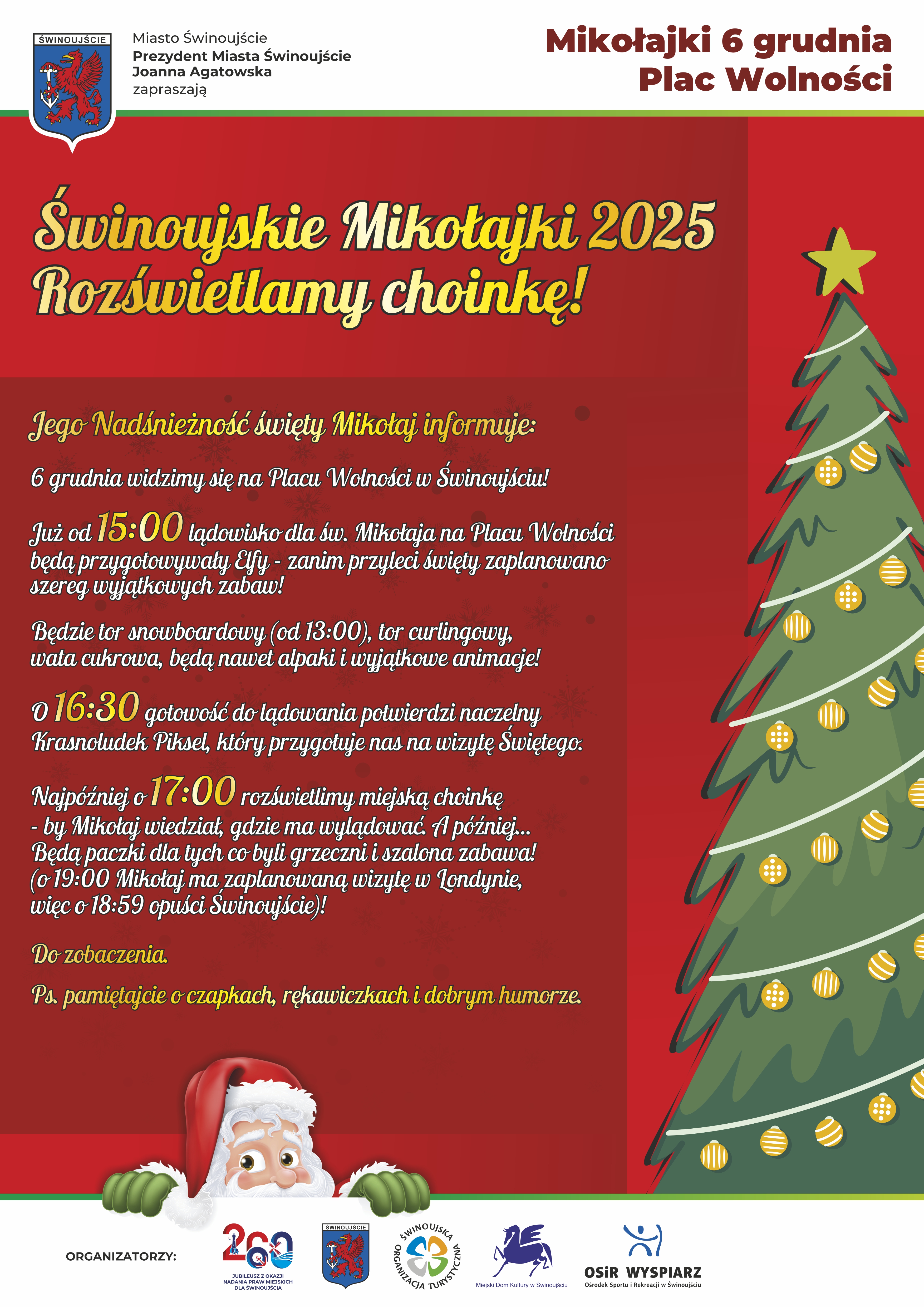 Najpóźniej o 17:00 rozświetlimy miejską choinkę – by Mikołaj wiedział, gdzie ma wylądować A później… Będą paczki dla tych, co byli grzeczni i szalona zabawa! (o 19:00 Mikołaj ma zaplanowaną wizytę w Londynie , więc o 18:59 opuści Świnoujście!).