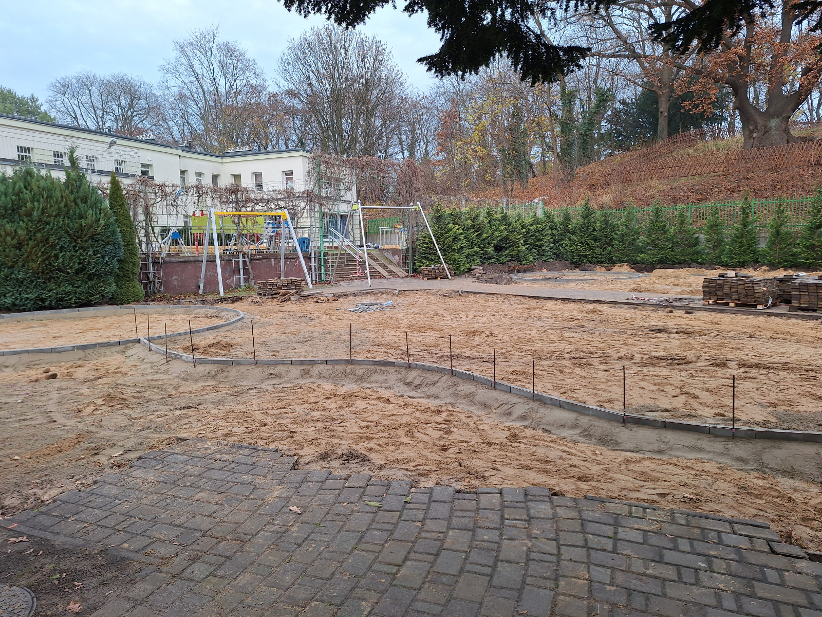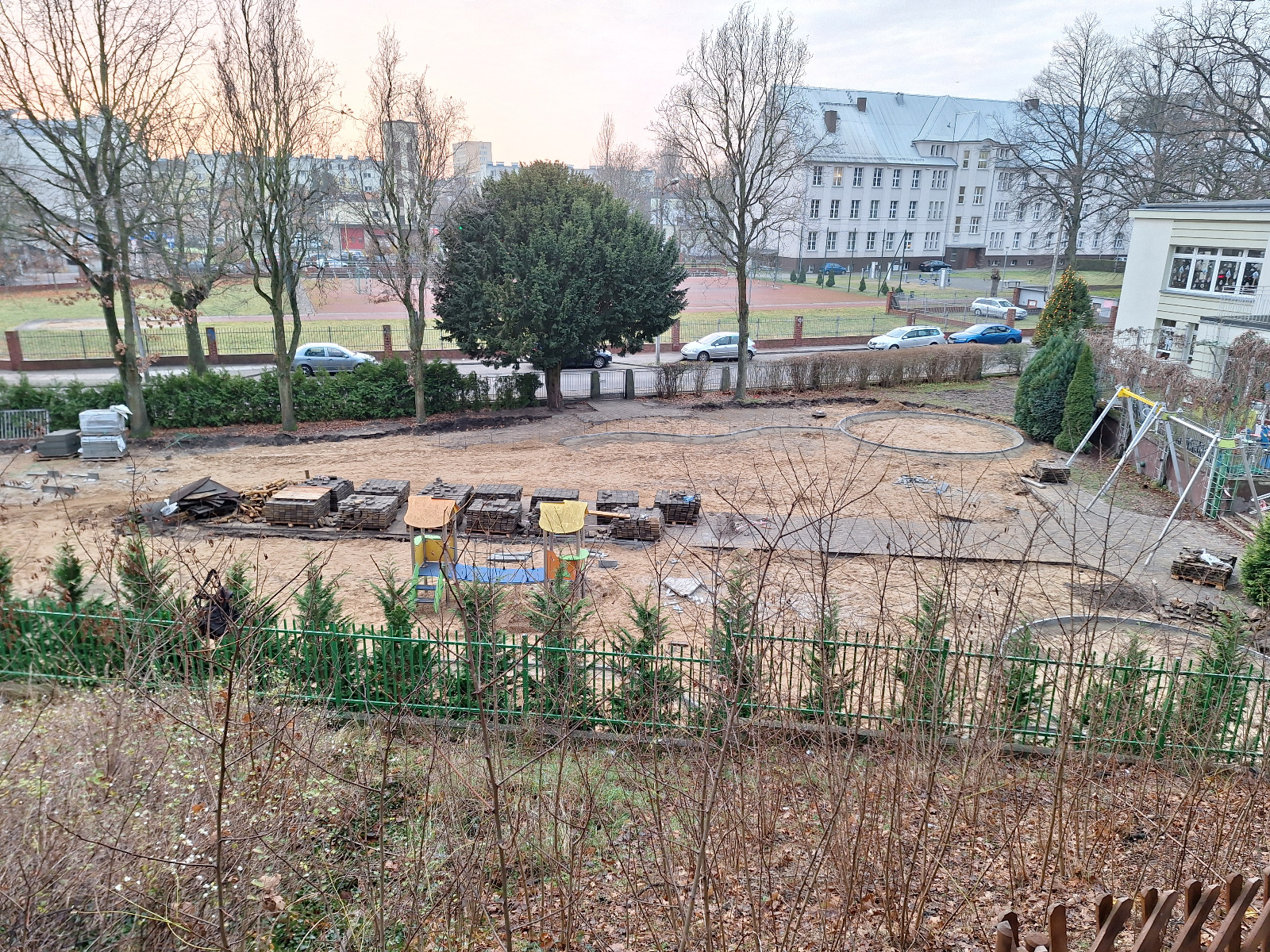 Przebudowa obejmuje również wykonanie instalacji technicznych, które wpłyną na bezpieczeństwo oraz funkcjonalność placu. Zostanie przygotowana instalacja elektryczna pod przyszłe oświetlenie, pojawią się kamery wizyjne oraz system nagłaśniający. Dodatkowo powstanie instalacja wodna umożliwiająca mycie rąk i zabawy w okresie letnim, takie jak brodzenie w kałuży z piaskiem czy podlewanie roślin. W ramach projektu zamontowane zostaną także pompy wodne, które pozwolą dzieciom na kreatywne eksperymentowanie z wodą i piaskiem.