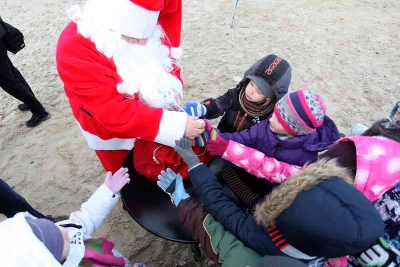 Świętego na plaży przywitały przedszkolaki oraz Pani Prezydent Joanna Agatowska, która zaprosiła Mikołaja na zwiedzanie pięknego kurortu na wyspach i wycieczkę na najwyższą na polskim wybrzeżu latarnię, aby z góry podziwiał 44 wyspy. Od władz miasta Mikołaj otrzymał prezent. Odwdzięczył się oczywiście słodkościami .