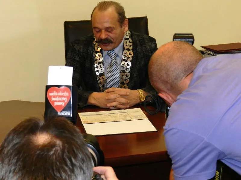 Dziś szczecinianin Leszek Szaciłło już po raz drugi przez jeden dzień będzie honorowym prezydentem Świnoujścia. Pracę zaczął od podpisania… czeku na 2 tysiące złotych, który przekaże dzieciom z Przedszkola Miejskiego nr 11. Zobacz zdjęcia.Jednodniowy honorowy urząd prezydenta miasta już po raz drugi z rzędu wylicytował podczas ostatniego Finału Wielkiej Orkiestry Świątecznej Pomocy. Certyfikat uprawniający do piastowania tej funkcji prezydent miasta Janusz Żmurkiewicz przekazuje na licytację Wielkiej Orkiestry Świątecznej Pomocy już od czterech lat.