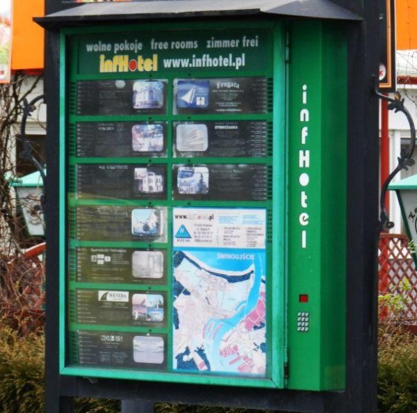 Tablica typu infomat należała do prywatnej, krakowskiej firmy. Była reklamą miejsc noclegowych do wynajęcia w Świnoujściu. Stała w tzw. starej części promenady, koło kompleksu gastronomicznego „Słodkie Centrum”.