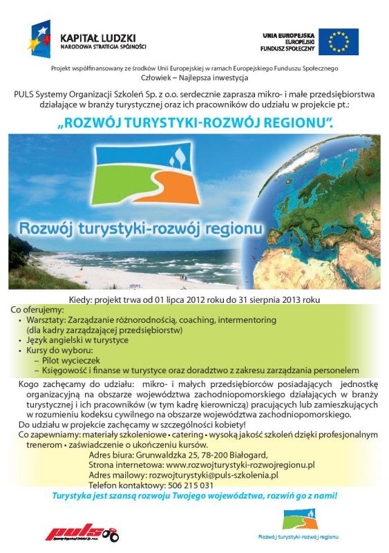 Kursy językowe, dla pilotów wycieczek, księgowe i finansowe, zarządzanie, intermentoring to propozycje szkoleń, które zostaną przeprowadzone w Świnoujściu dla osób zajmujących się na co dzień turystyką. Odbycie się kursów możliwe jest dzięki programowi „Rozwój turystyki – rozwój regionu”, prowadzenie powierzono firmie „Puls System Organizacji Szkoleń”. Projekt skierowany jest zarówno do kadry kierowniczej jak i pracowników (zatrudnionych na podstawie umowy o pracę) szeregowych mikro i małych przedsiębiorstw działających w branży turystycznej posiadających jednostkę organizacyjną na terenie województwa zachodniopomorskiego.