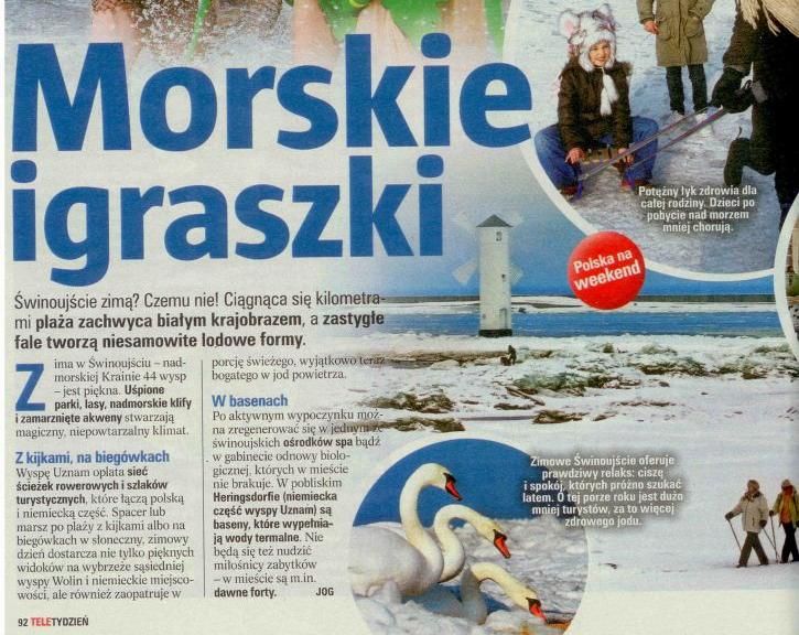 Obszerny materiał zdjęciowy oraz opis miejsc i walorów miasta w zimowej aurze to promocja Świnoujścia jaka trafia do czytelników popularnego pisma w całej Polsce. „Morskie igraszki” takim tytułem autor artykułu zachęca do odwiedzenia wyspy Uznam.