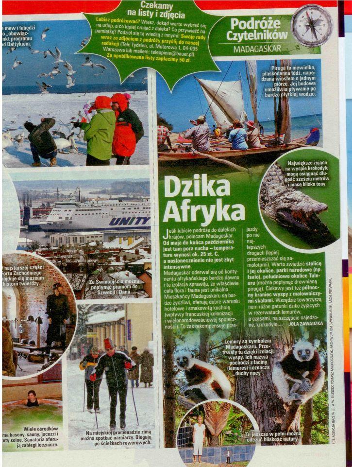 Zalety pobytu w Świnoujściu zimą zachwala artykuł jaki się ukazał w najnowszym wydaniu tygodnika Tele Tydzień. - Jest to kolejna publikacja w ogólnopolskiej prasie kolorowej na temat uroków Świnoujścia, która ukazała się dzięki strategii promocji miasta jaka została przyjęta przez Wydział Promocji, Turystyki, Kultury i Sportu. - mówi Katarzyna Rówińska naczelnik Wydziału.