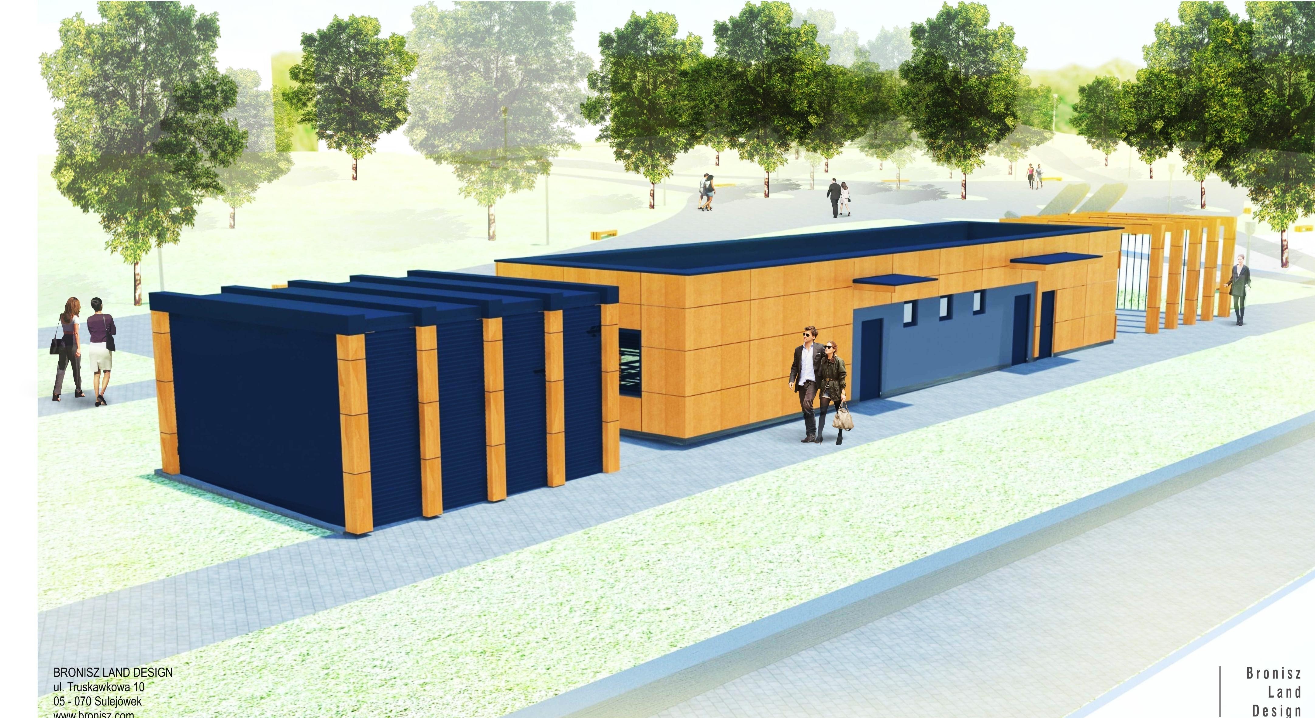 W budynku znajdować się będzie sala wielofunkcyjna z przyległymi sanitariatami (damski, męski i dla niepełnosprawnych) oraz pomieszczenia obsługi parku. Elewacja wykonana zostanie z paneli drewnopodobnych HPL w naturalnego drewna bejcowanego, miejscami uzupełniona tynkiem elewacyjnym. Całości towarzyszyć będzie pergola z zielenią. Sam budynek będzie parterowy, niepodpiwniczony o wymiarach 5,82x21,72 metra oraz wysokości całkowitej 3,7 metra. Wzdłuż ściany budynku przewiduje się lokalizację tymczasowej sceny lub przenośnego ekranu (na elewacji) do pokazów multimedialnych.