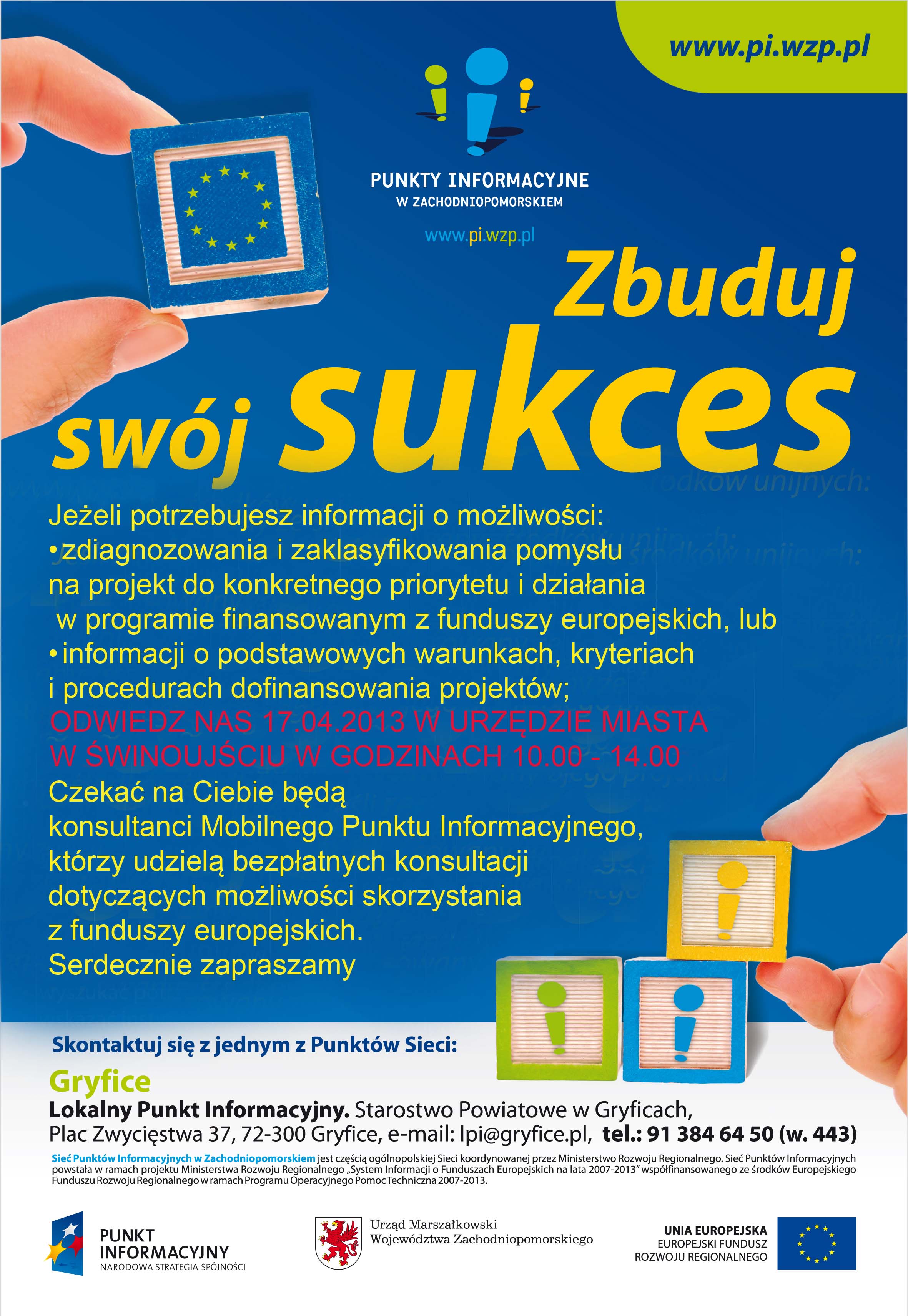 W dniu 17 kwietnia 2013 r. od godz.10.00 do 14.00, w sali 130 Urzędu Miasta Świnoujście odbędą konsultacje prowadzone przez Konsultantów Mobilnego Punktu Informacyjnego, którzy udzielą bezpłatnych konsultacji dotyczących możliwości skorzystania z funduszy europejskich.