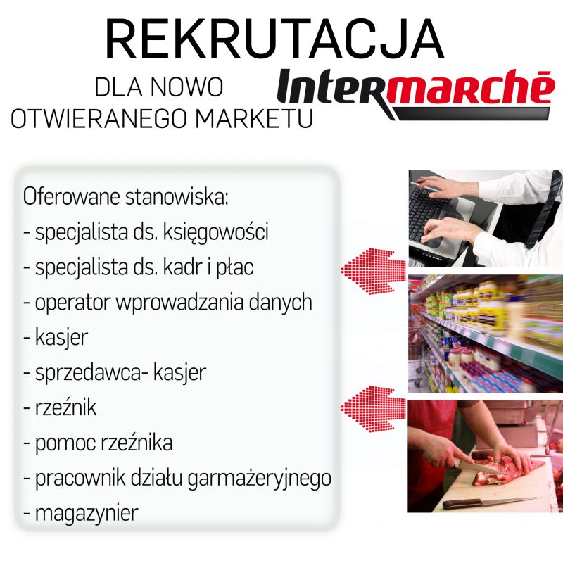 Jeżeli jesteś zainteresowany pracą w Intermarche- prześlij swoje CV na adres: doradca@pup.swinoujscie.pl. W tytule wiadomości proszę wpisać nazwę stanowiska. CV można również złożyć w siedzibie Powiatowego Urzędu Pracy w pok. nr 3 i 4.