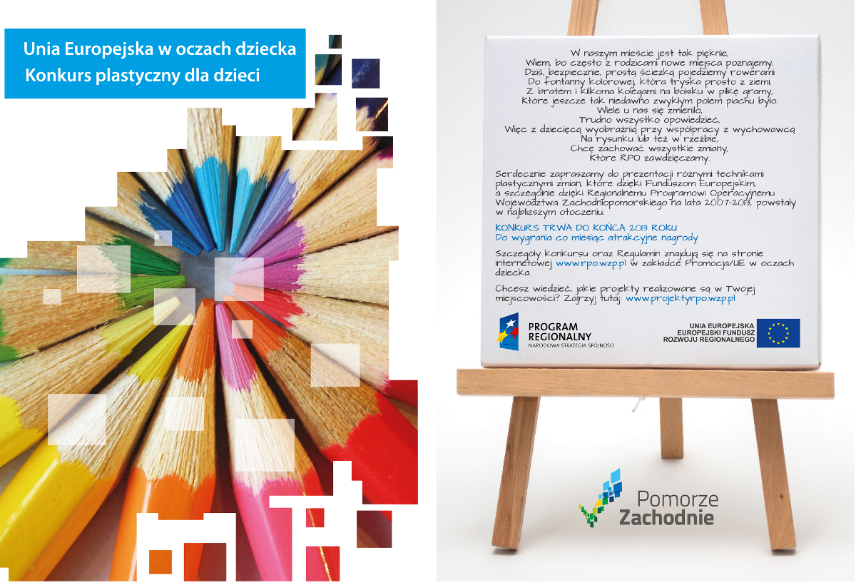 Urząd Marszałkowski Województwa Zachodniopomorskiego zaprasza do konkursu „Unia Europejska w oczach dziecka”. Do wygrania są bardzo atrakcyjne nagrody. Zadaniem dzieci jest stworzenie prac przedstawiających zmiany jakie nastąpiły na Pomorzu Zachodnim dzięki środkom Unii Europejskiej.