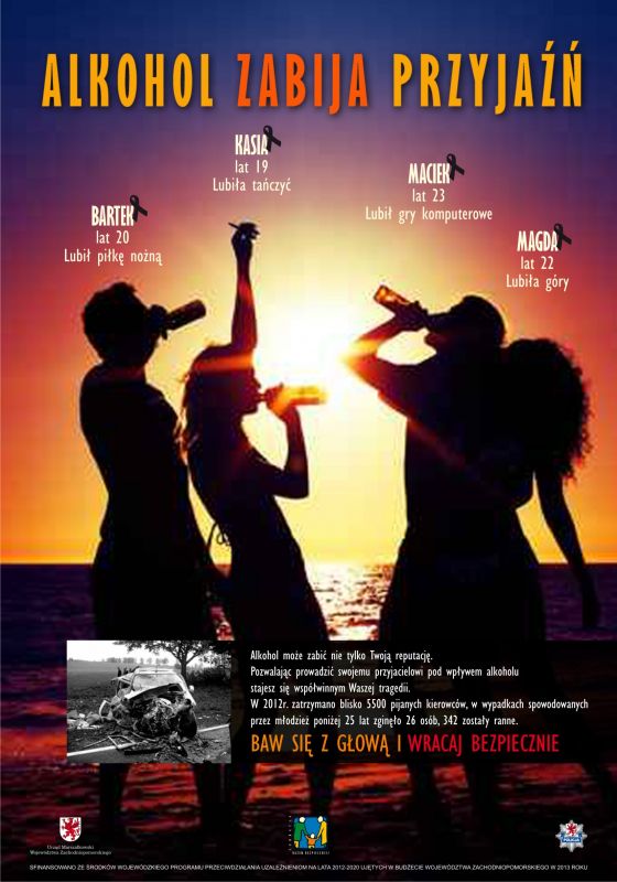 Policja Zachodniopomorska wspólnie z Fundacją Razem Bezpieczniej i Urzędem Marszałkowskim Województwa Zachodniopomorskiego zainicjowały kampanię informacyjną „ALKOHOL ZABIJA PRZYJAŹŃ”, która jest adresowana do młodzieży w wieku 18-25 lat, a w szczególności do młodych kierowców. Ma ona za zadanie pobudzenie świadomości tej grupy wiekowej na temat skutków kierowania pojazdami będąc pod wpływem alkoholu bądź innych środków odurzających.