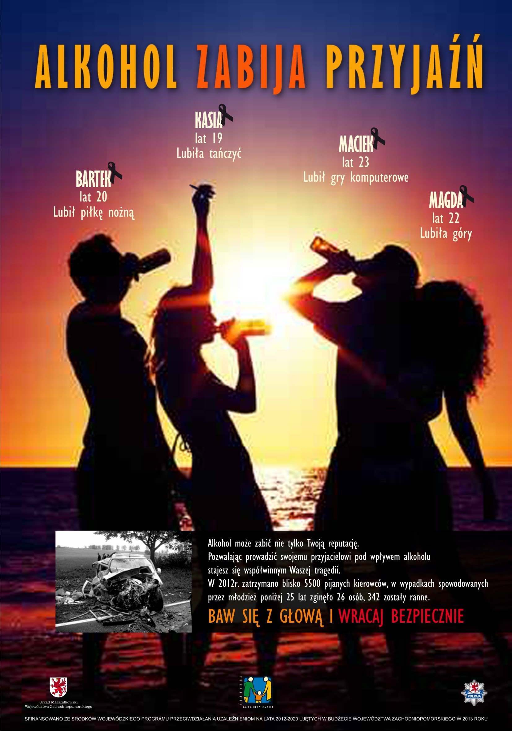 Plakat reklamowy kampanii „ALKOHOL ZABIJA PRZYJAŹŃ”pokazuje grupę młodzieży, bawiącej się na plaży i korzystającej z używek, ale pokazuje też wrak rozbitego samochodu, który sugeruje skutki takiej zabawy. Mamy nadzieję, że w ten sposób wspólnie wpłyniemy na wyobraźnię młodych ludzi, aby w trakcie bieżących wakacji było jak najmniej takich zdarzeń, a używki nie stanowiły podstawowego powodu dla dobrej, wakacyjnej zabawy.