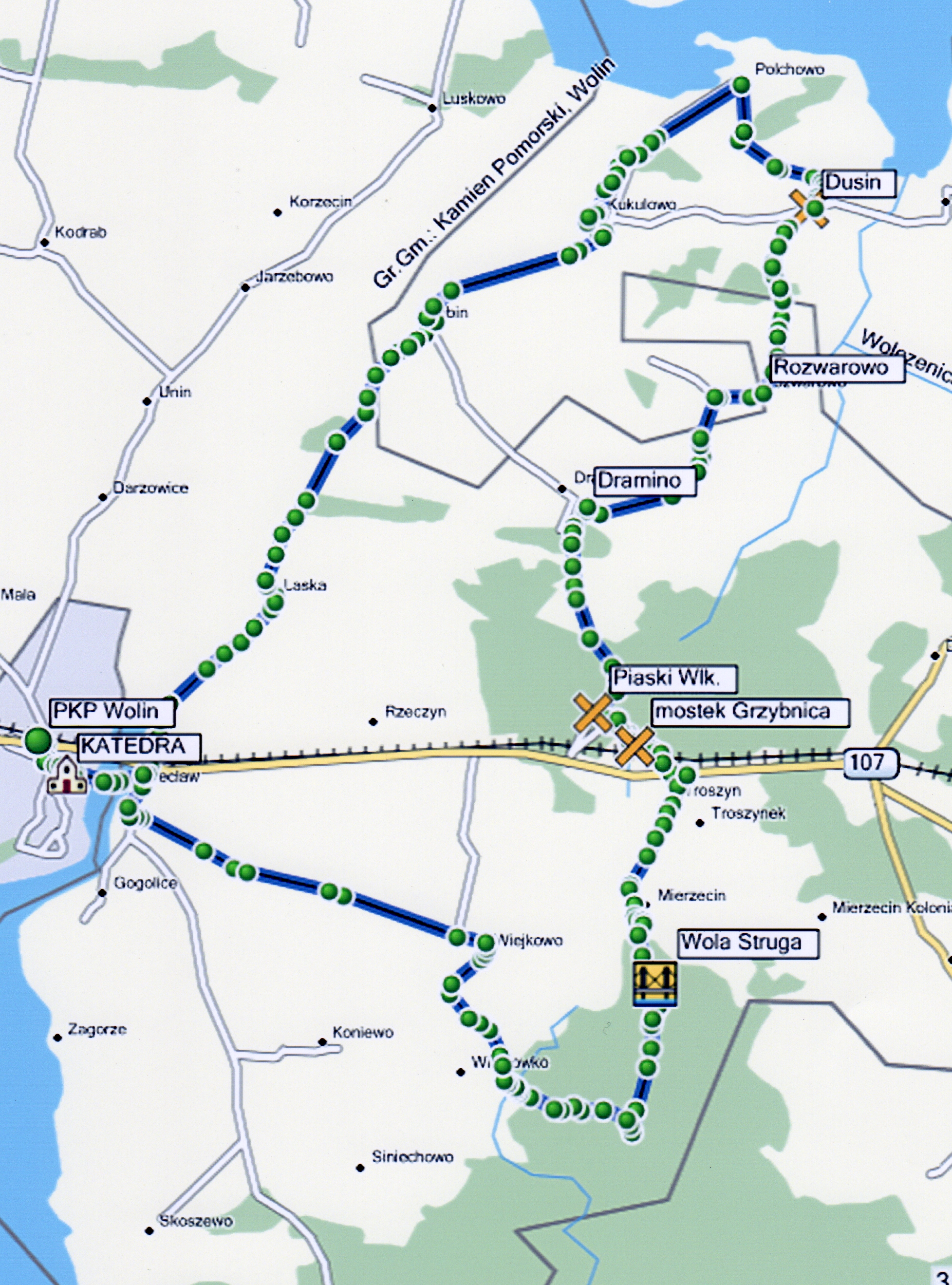 Wolin-Kukułowo-Połchowo-Dusin-Rozwarowo-J.Piaski-mostek na Grzybnicy-dookoła J.Ostrowie-J.Wiejkowo-park elektrowni wiatrowych-Wolin-Mokrzyca-Dargobądź-szlak rowerowy WPN-J.Turkusowe w Wapnicy-Świnoujście.