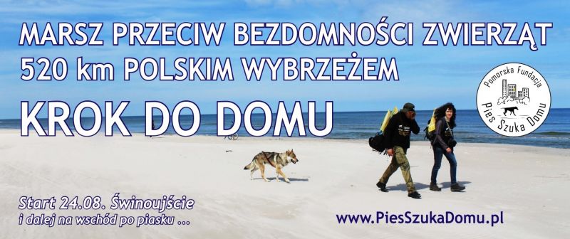 W tym roku wolontariusze Fundacji po raz drugi ruszają z psiakami 24 sierpnia o godz. 9.00 ze Świnoujścia( plaża , granica z Niemcami) pod hasłem „Krok do domu” .