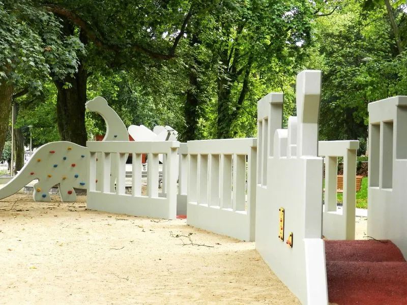 W przebudowanym parku jest plac zabaw dla dzieci z figurami przypominających wyglądem dinozaura, samochód, samolot, konia, rakietę, pociąg , poza tym terenowa siłownia, pole do gry w boule oraz szachy, stok saneczkowy, publiczna toaleta, liczne elementy małej infrastruktury, jak: ławki i oryginalne miejsca do wypoczynku tzw. siedziska terenowe, altany parkowe, zewnętrzna galeria, ścieżka dydaktyczna, stojaki na rowery, powstał też budynek z częścią administracyjną do obsługi parku oraz salą do zajęć dydaktycznych i ścianą przygotowaną do projekcji filmowych.